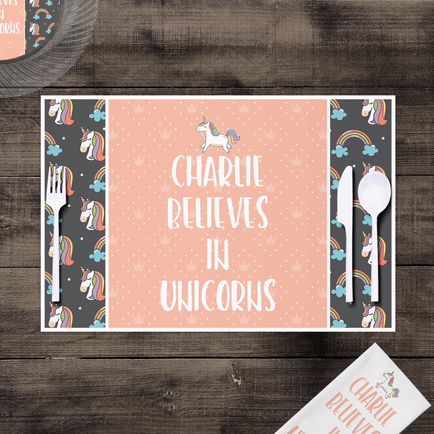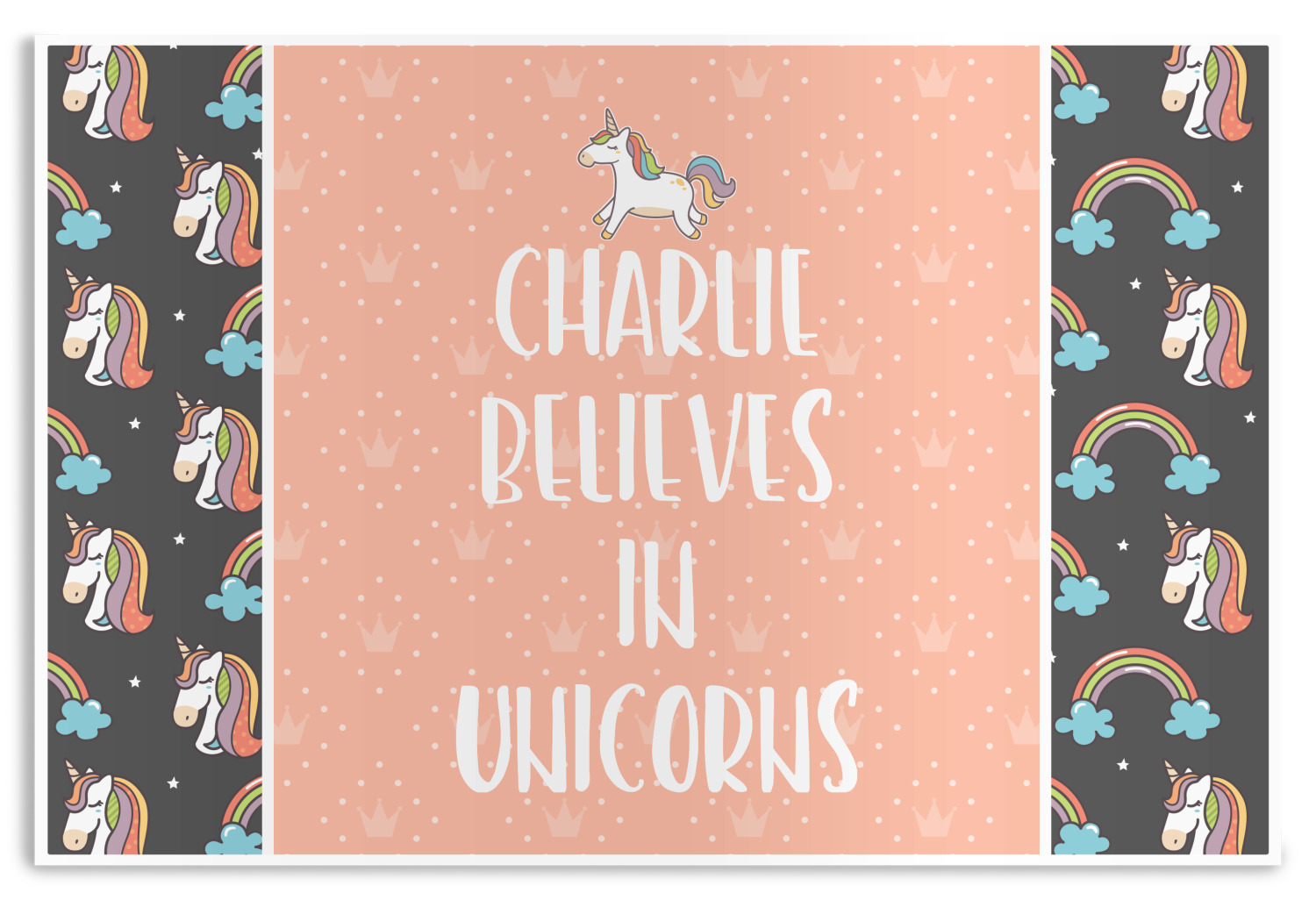 This fun unicorn design has a dark grey background with brightly colored unicorns and rainbows all across it.This pattern is on either side of a peach background with subtle crowns on it. Front and center is a fun saying that says "Charlie Believes In Unicorns" where "Charlie" can be replaced with your name. On the top of this text is a majestic leaping unicorn.