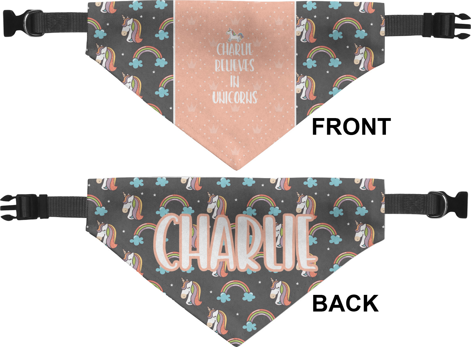 We print the front and back of these dog bandanas with your customized design. The bandana itself is made from a durable polyester, sewn together with a gap large enough to accommodate any collar. Regardless, the bandana includes a plain black, canvas collar with plastic snaps, that can easily be removed if desired. These dog bandana collars are available in four sizes: small, medium, large, and extra large. Please see our sizing chart for more information regarding the dimensions of each size.