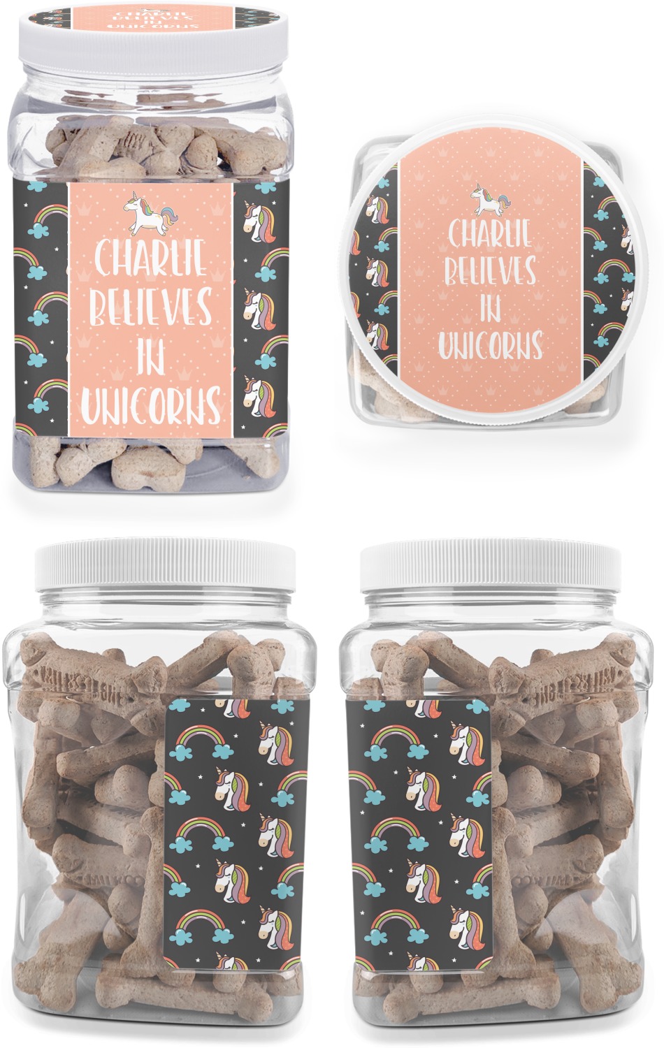 This half gallon jar, made from a sturdy plastic, is the perfect way to keep treats from any naughty pet paws, while still keeping them ready on hand for when your pup performs an impressive trick. This dog cookie jar features a screw-on, white lid that displays your personalized design on a vinyl sticker. We apply another customized sticker that wraps around the front and sides of the jar. Our dog treat jar also has indentations on the rear ends of the sides, which allows for convenient handling, and its square frame allows for easy storage.