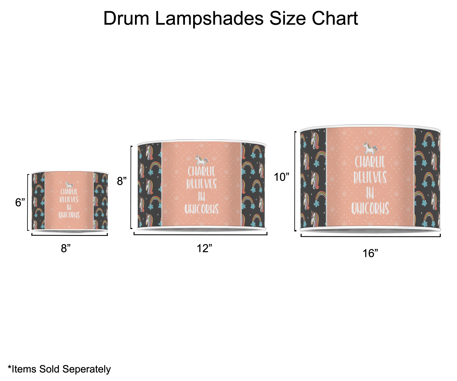 Our customized lamp shades also come in 3 different sizes: 8", 12" and 16", measuring at 8" in diameter by 6" tall, 12" in diameter by 8" tall, and 16" in diameter by 10" tall, respectively.