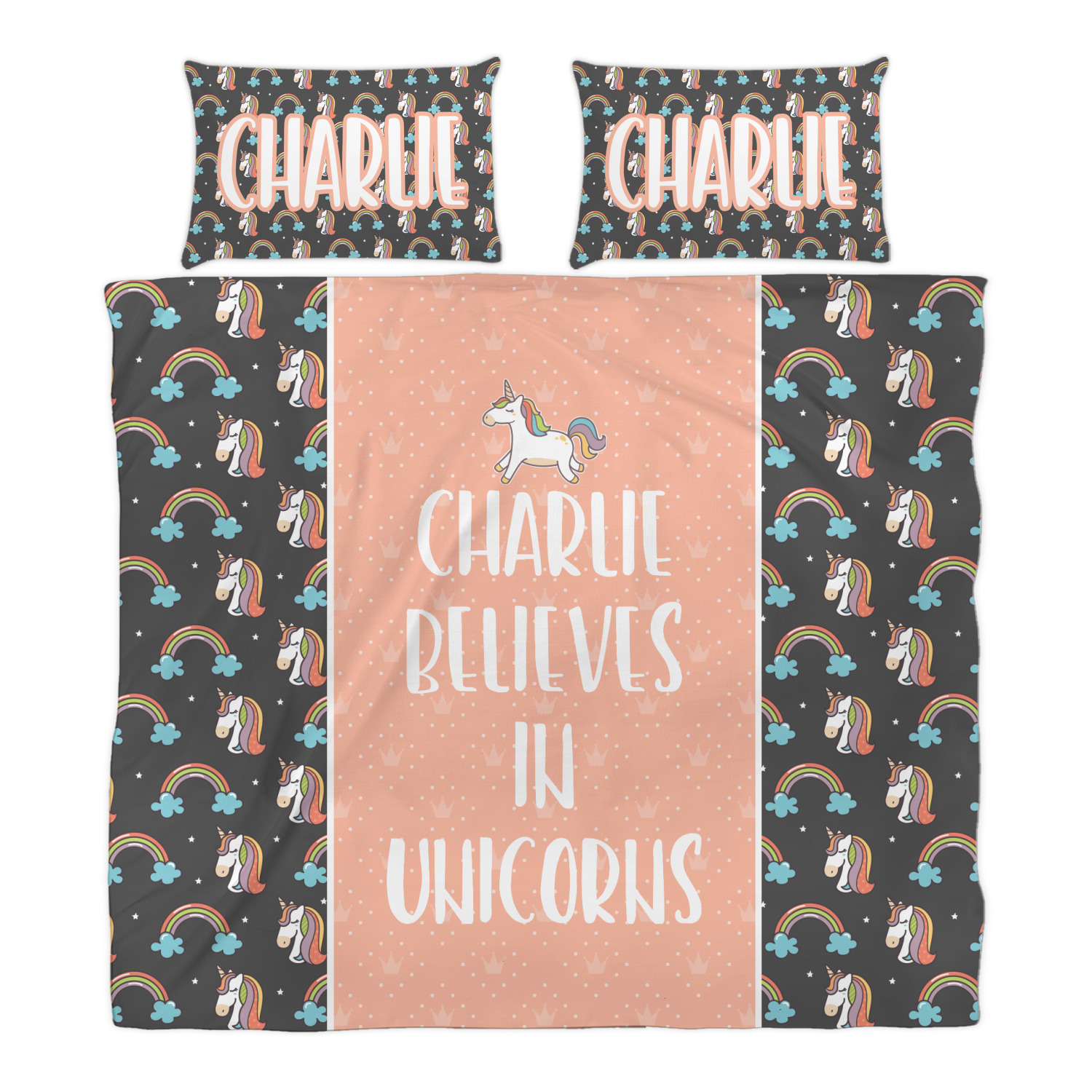 This fun unicorn design has a dark grey background with brightly colored unicorns and rainbows all across it.This pattern is on either side of a peach background with subtle crowns on it. Front and center is a fun saying that says "Charlie Believes In Unicorns" where "Charlie" can be replaced with your name. On the top of this text is a majestic leaping unicorn.