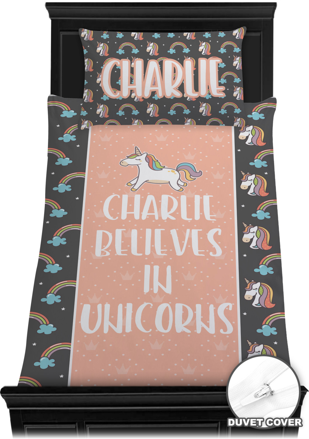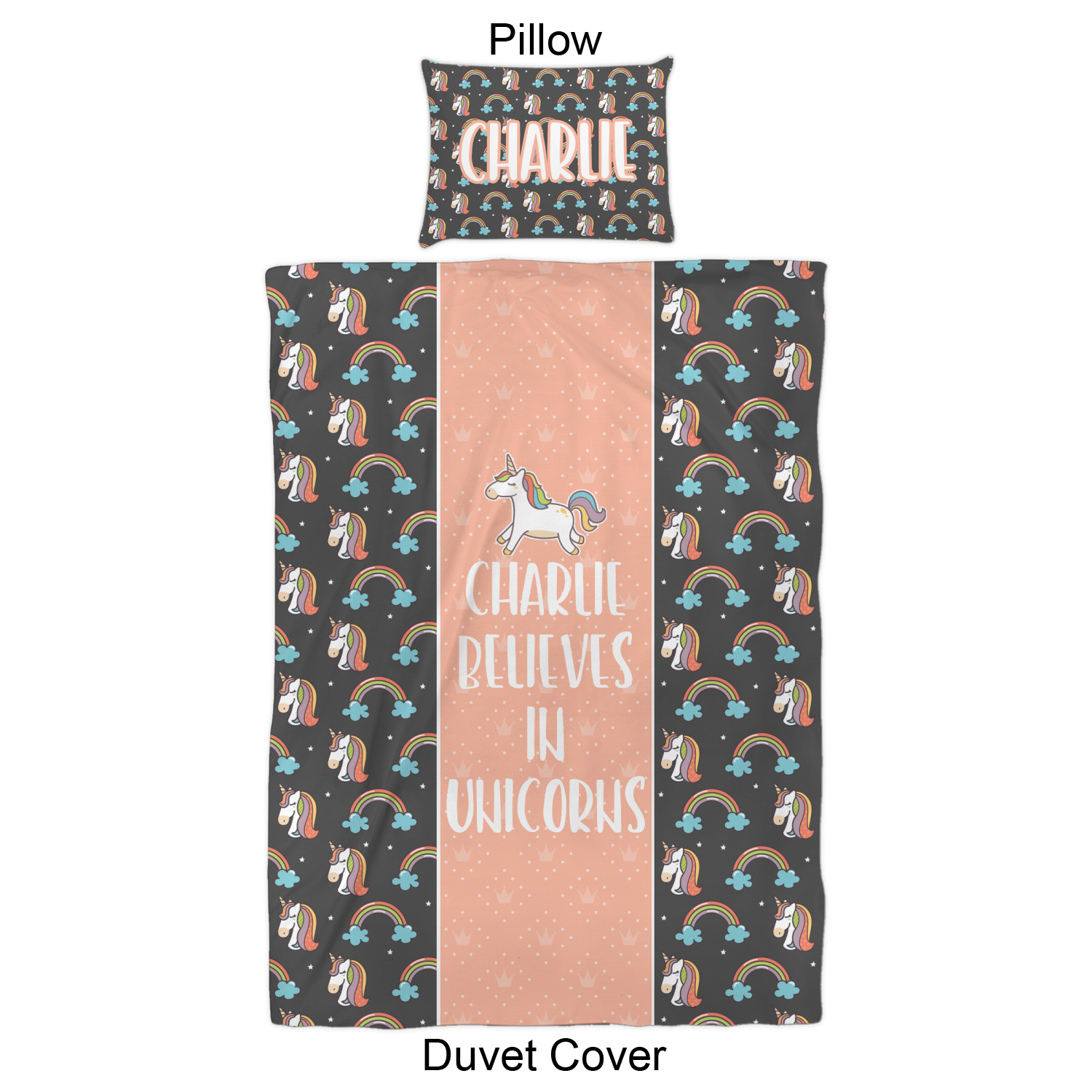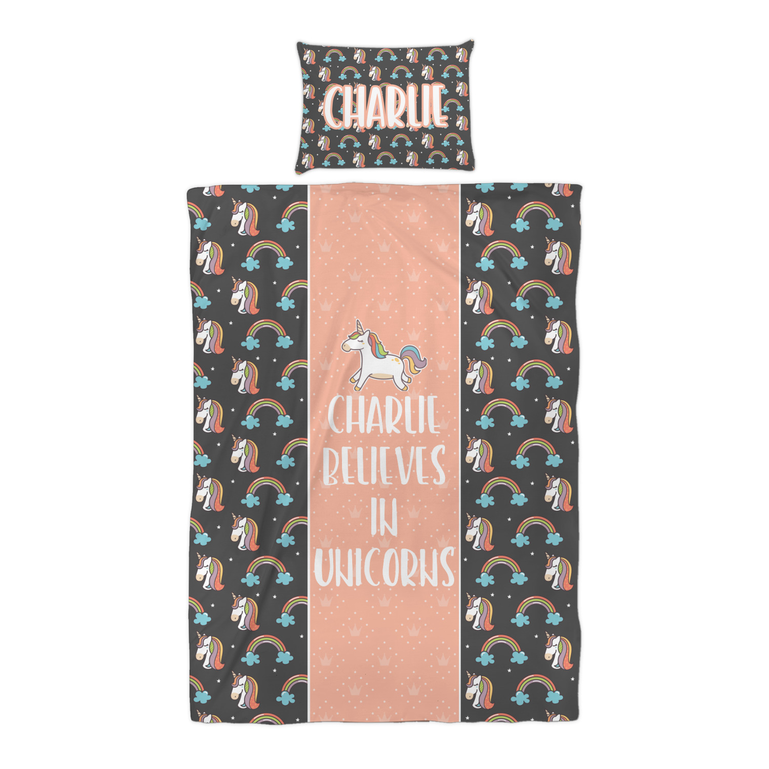 This fun unicorn design has a dark grey background with brightly colored unicorns and rainbows all across it.This pattern is on either side of a peach background with subtle crowns on it. Front and center is a fun saying that says "Charlie Believes In Unicorns" where "Charlie" can be replaced with your name. On the top of this text is a majestic leaping unicorn.