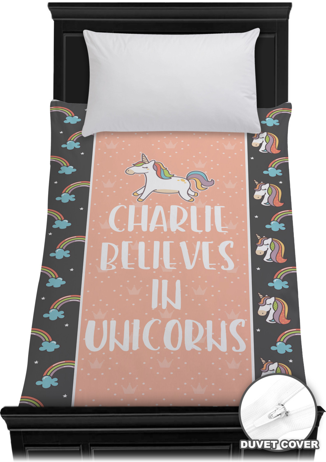 This fun unicorn design has a dark grey background with brightly colored unicorns and rainbows all across it.This pattern is on either side of a peach background with subtle crowns on it. Front and center is a fun saying that says "Charlie Believes In Unicorns" where "Charlie" can be replaced with your name. On the top of this text is a majestic leaping unicorn.