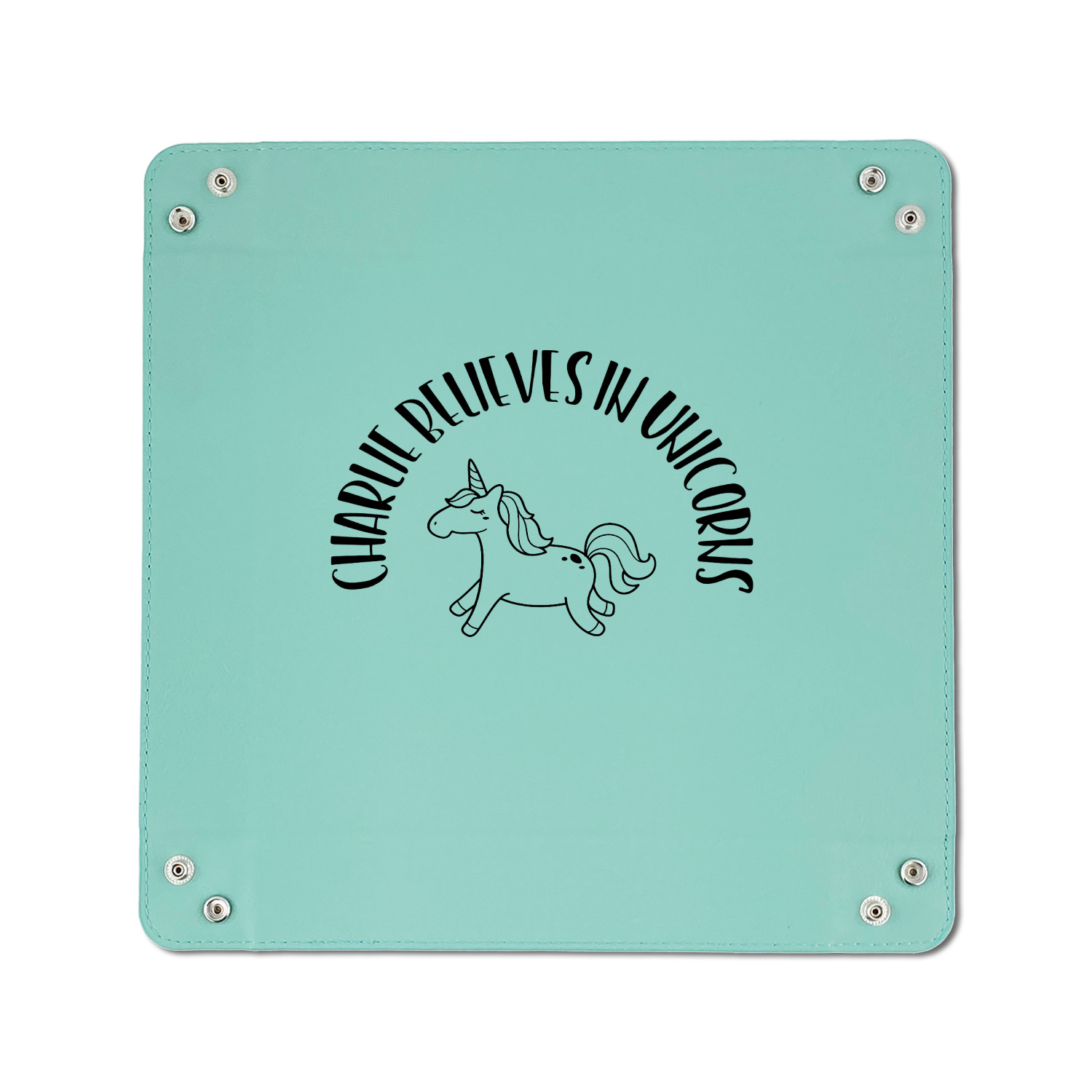This fun unicorn design has a dark grey background with brightly colored unicorns and rainbows all across it.This pattern is on either side of a peach background with subtle crowns on it. Front and center is a fun saying that says "Charlie Believes In Unicorns" where "Charlie" can be replaced with your name. On the top of this text is a majestic leaping unicorn.