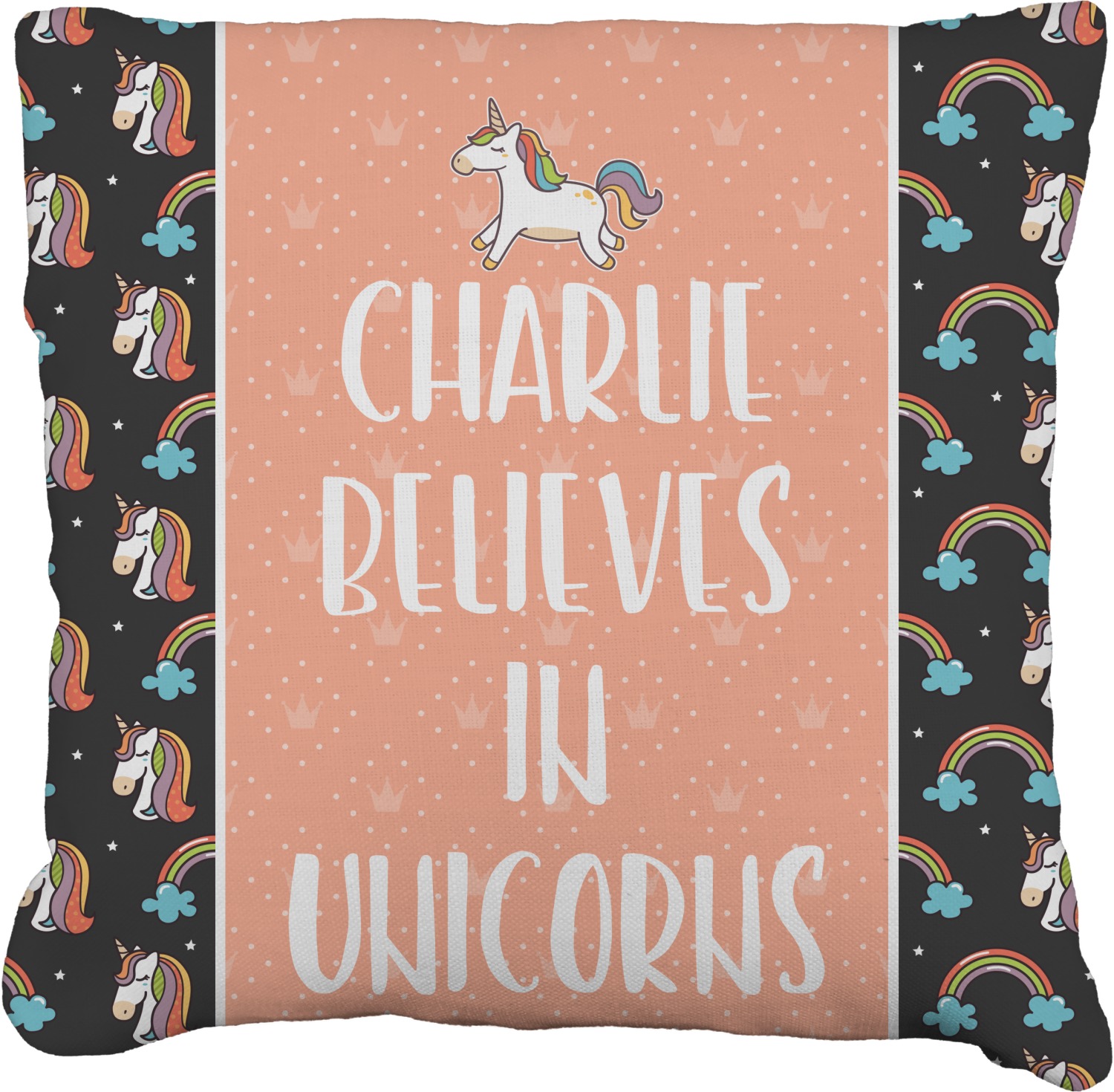 This fun unicorn design has a dark grey background with brightly colored unicorns and rainbows all across it.This pattern is on either side of a peach background with subtle crowns on it. Front and center is a fun saying that says "Charlie Believes In Unicorns" where "Charlie" can be replaced with your name. On the top of this text is a majestic leaping unicorn.