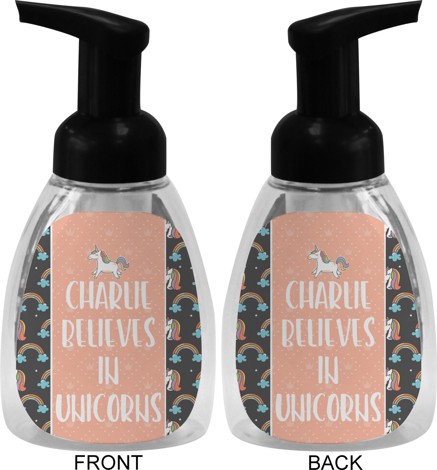 This soap dispenser is made of a robust plastic and has a clear base. The included soap pump is available in black or white color. This dispenser is 6.5 inches tall, 3 inches wide, and 2 inches deep. We display your customized designs on the front and back sides of these foaming hand soap dispensers.