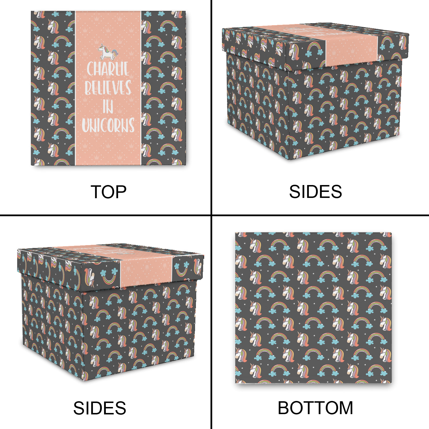 This fun unicorn design has a dark grey background with brightly colored unicorns and rainbows all across it.This pattern is on either side of a peach background with subtle crowns on it. Front and center is a fun saying that says "Charlie Believes In Unicorns" where "Charlie" can be replaced with your name. On the top of this text is a majestic leaping unicorn.