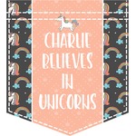 This fun unicorn design has a dark grey background with brightly colored unicorns and rainbows all across it.This pattern is on either side of a peach background with subtle crowns on it. Front and center is a fun saying that says "Charlie Believes In Unicorns" where "Charlie" can be replaced with your name. On the top of this text is a majestic leaping unicorn.