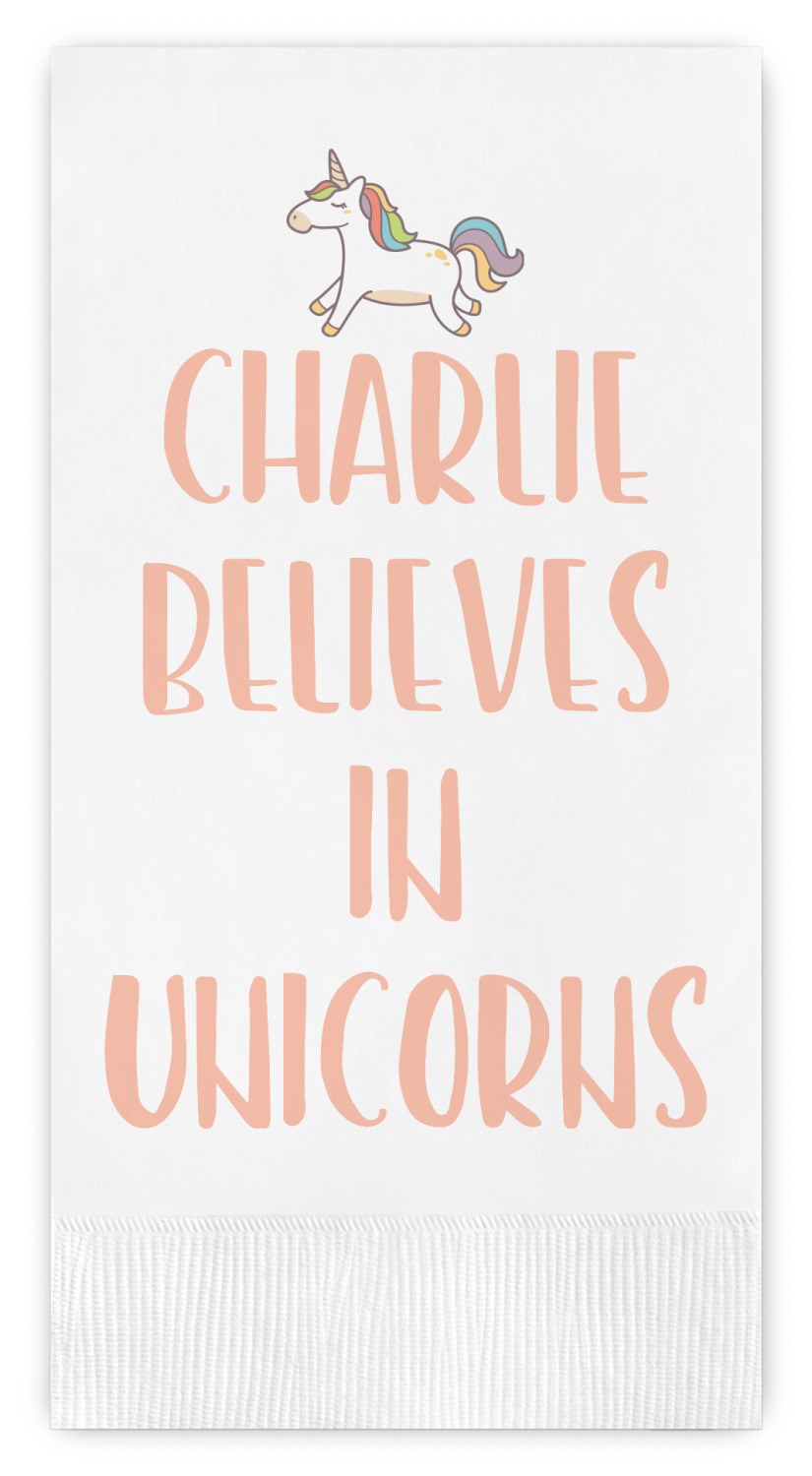 This fun unicorn design has a dark grey background with brightly colored unicorns and rainbows all across it.This pattern is on either side of a peach background with subtle crowns on it. Front and center is a fun saying that says "Charlie Believes In Unicorns" where "Charlie" can be replaced with your name. On the top of this text is a majestic leaping unicorn.