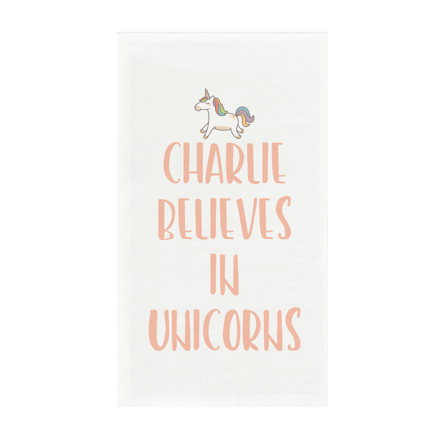 This fun unicorn design has a dark grey background with brightly colored unicorns and rainbows all across it.This pattern is on either side of a peach background with subtle crowns on it. Front and center is a fun saying that says "Charlie Believes In Unicorns" where "Charlie" can be replaced with your name. On the top of this text is a majestic leaping unicorn.