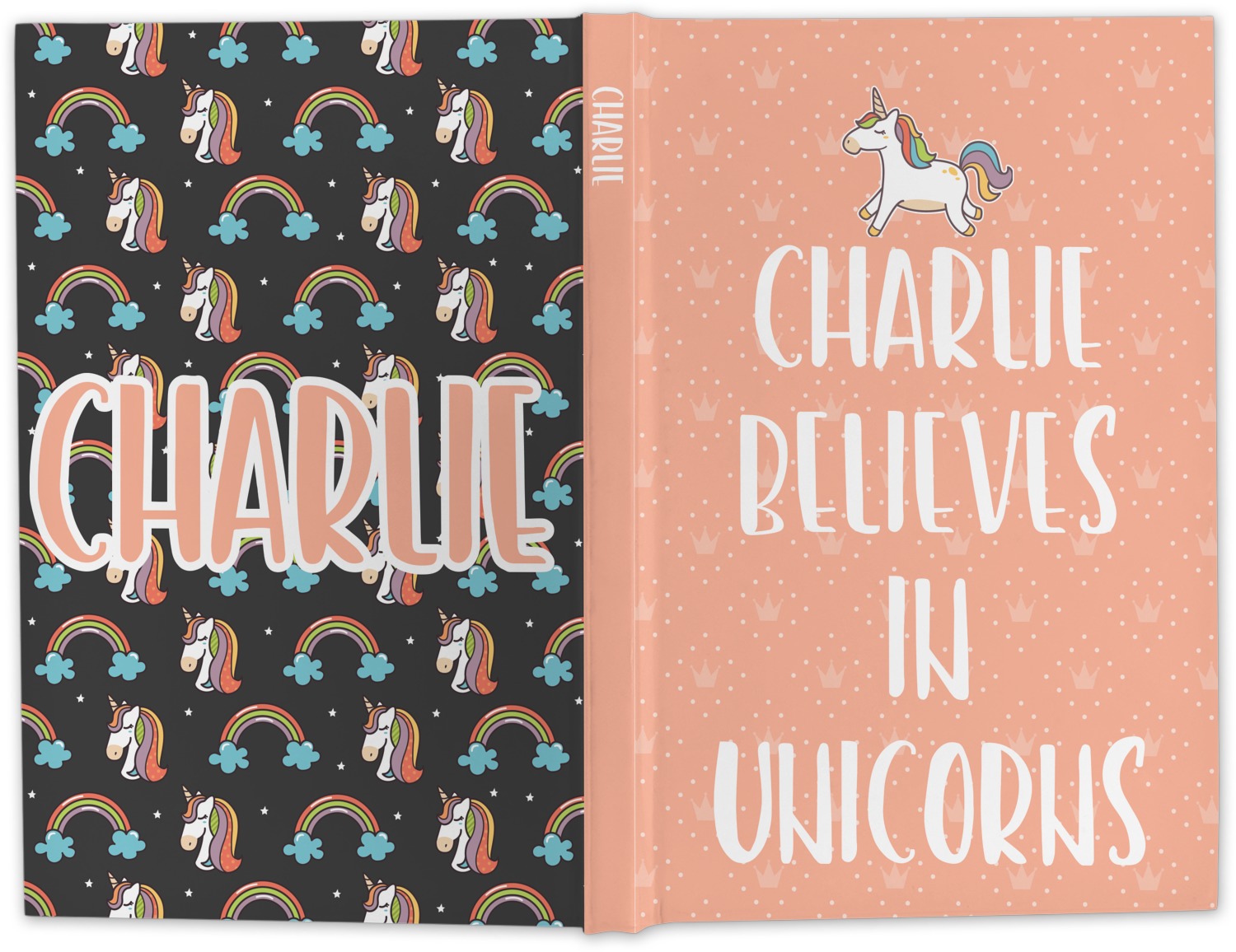 This fun unicorn design has a dark grey background with brightly colored unicorns and rainbows all across it.This pattern is on either side of a peach background with subtle crowns on it. Front and center is a fun saying that says "Charlie Believes In Unicorns" where "Charlie" can be replaced with your name. On the top of this text is a majestic leaping unicorn.