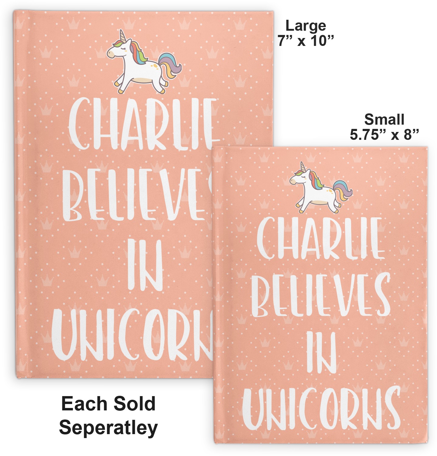 This fun unicorn design has a dark grey background with brightly colored unicorns and rainbows all across it.This pattern is on either side of a peach background with subtle crowns on it. Front and center is a fun saying that says "Charlie Believes In Unicorns" where "Charlie" can be replaced with your name. On the top of this text is a majestic leaping unicorn.