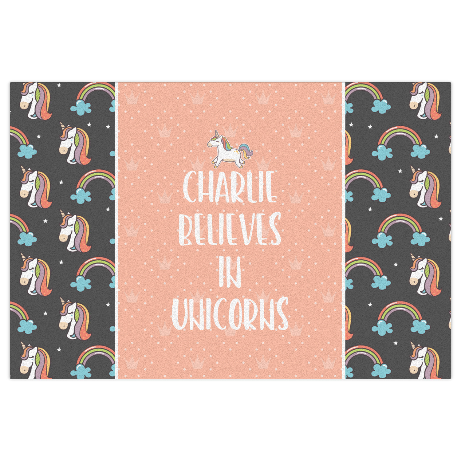 This fun unicorn design has a dark grey background with brightly colored unicorns and rainbows all across it.This pattern is on either side of a peach background with subtle crowns on it. Front and center is a fun saying that says "Charlie Believes In Unicorns" where "Charlie" can be replaced with your name. On the top of this text is a majestic leaping unicorn.