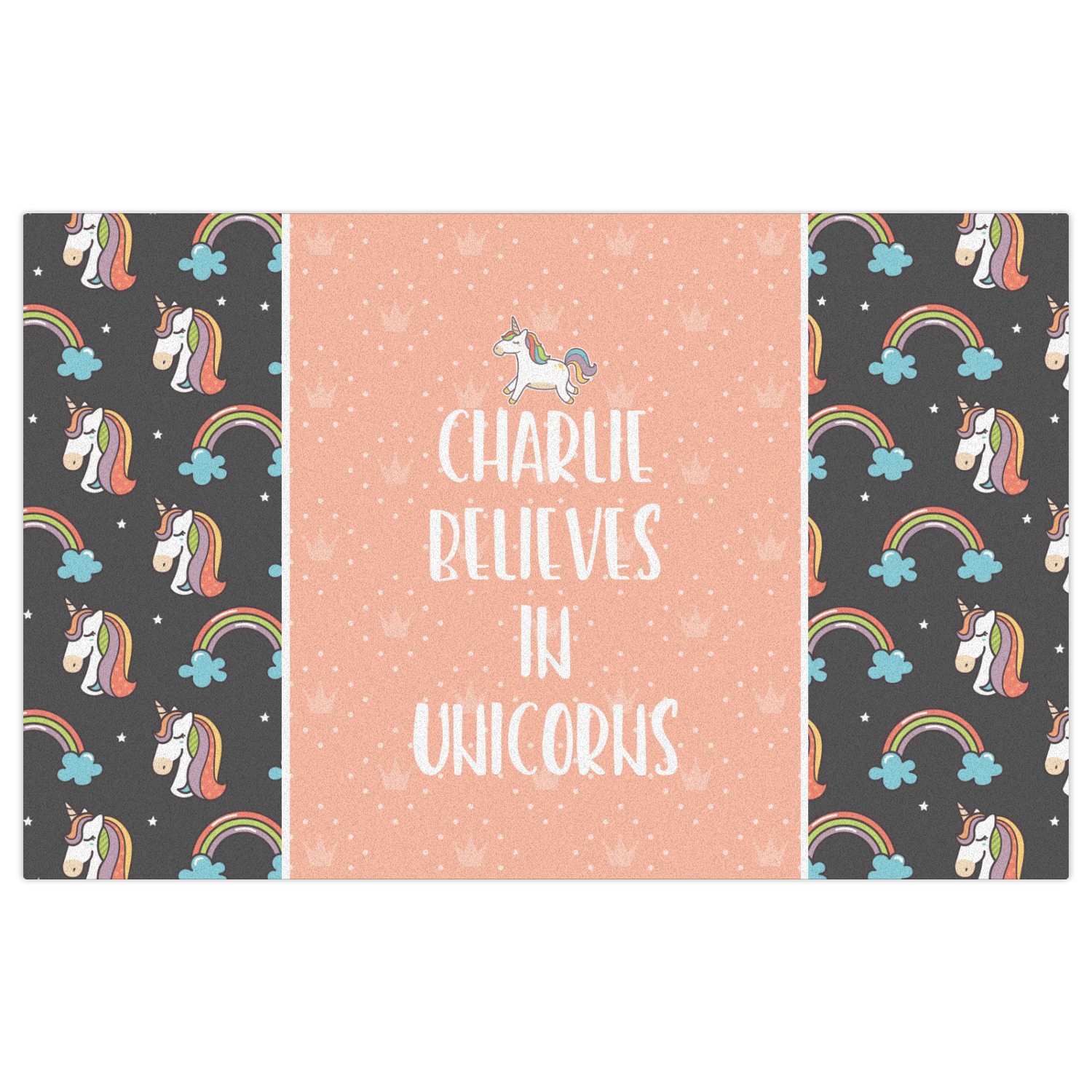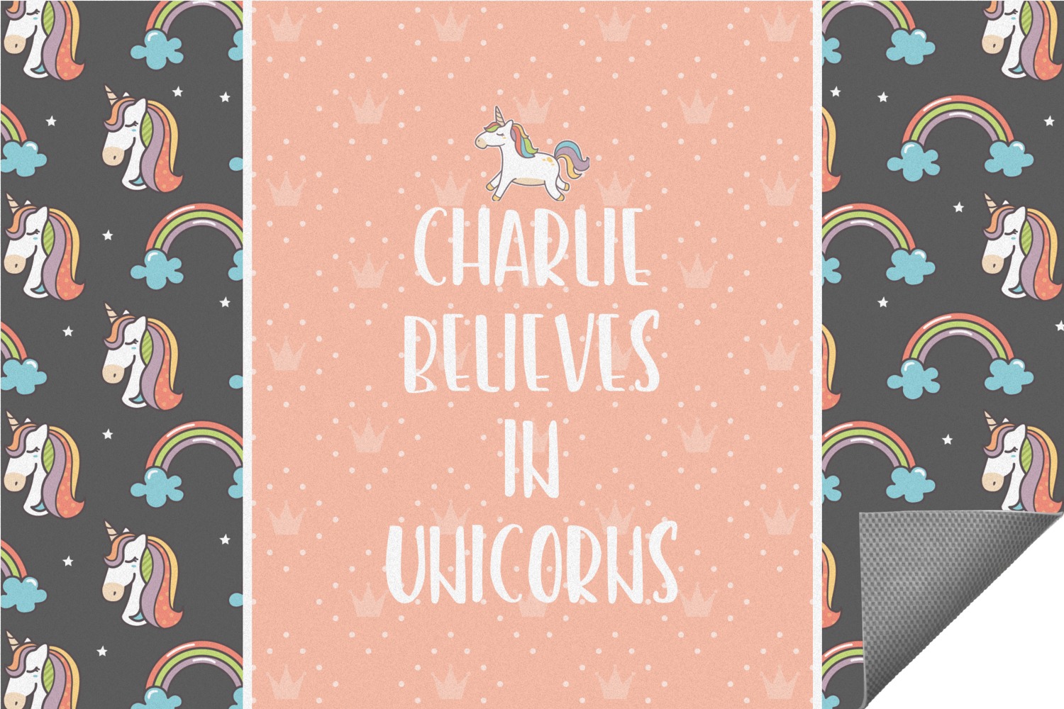 This fun unicorn design has a dark grey background with brightly colored unicorns and rainbows all across it.This pattern is on either side of a peach background with subtle crowns on it. Front and center is a fun saying that says "Charlie Believes In Unicorns" where "Charlie" can be replaced with your name. On the top of this text is a majestic leaping unicorn.