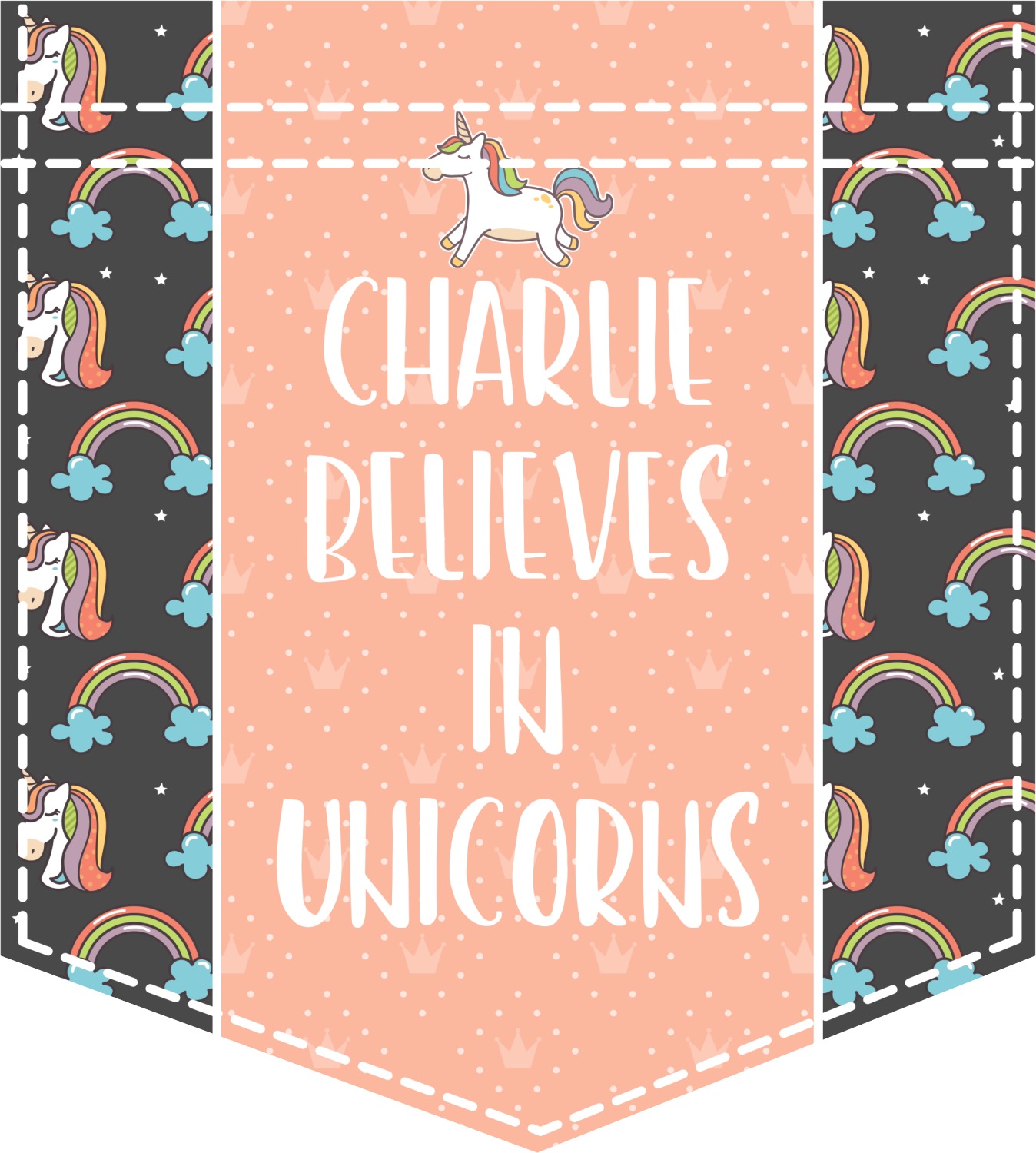 This fun unicorn design has a dark grey background with brightly colored unicorns and rainbows all across it.This pattern is on either side of a peach background with subtle crowns on it. Front and center is a fun saying that says "Charlie Believes In Unicorns" where "Charlie" can be replaced with your name. On the top of this text is a majestic leaping unicorn.