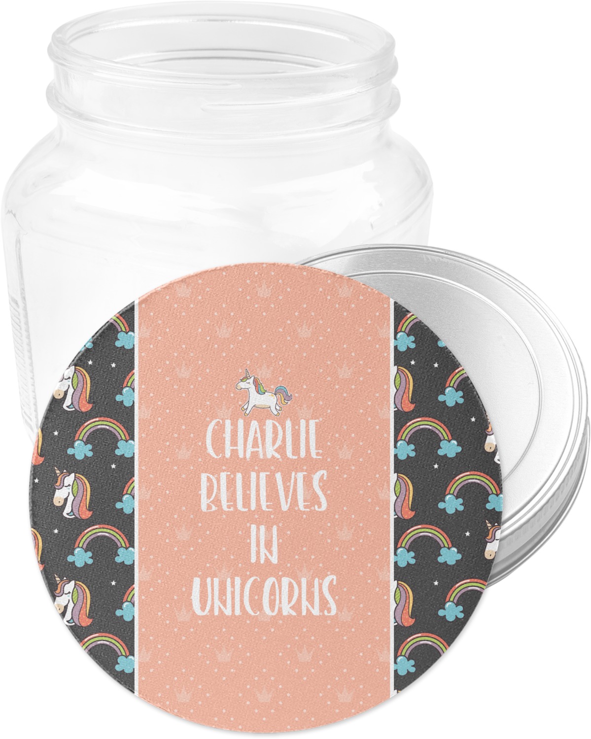 This fun unicorn design has a dark grey background with brightly colored unicorns and rainbows all across it.This pattern is on either side of a peach background with subtle crowns on it. Front and center is a fun saying that says "Charlie Believes In Unicorns" where "Charlie" can be replaced with your name. On the top of this text is a majestic leaping unicorn.