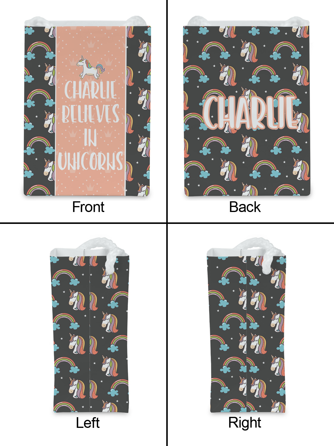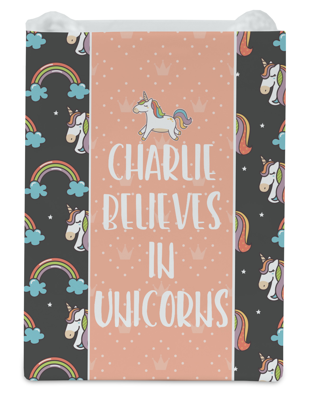 This fun unicorn design has a dark grey background with brightly colored unicorns and rainbows all across it.This pattern is on either side of a peach background with subtle crowns on it. Front and center is a fun saying that says "Charlie Believes In Unicorns" where "Charlie" can be replaced with your name. On the top of this text is a majestic leaping unicorn.