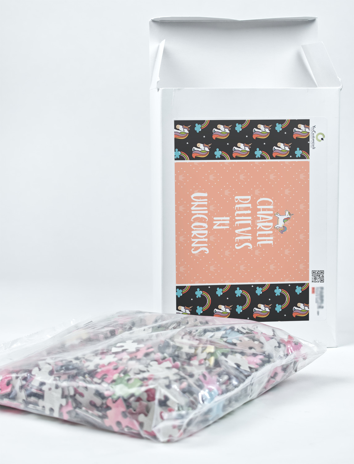 You can also upload your logo or art that you or your kids drew. To create more challenging jigsaw puzzles, you can create a pattern from with your logo or artwork. You can also add other elements such as text or personalization.