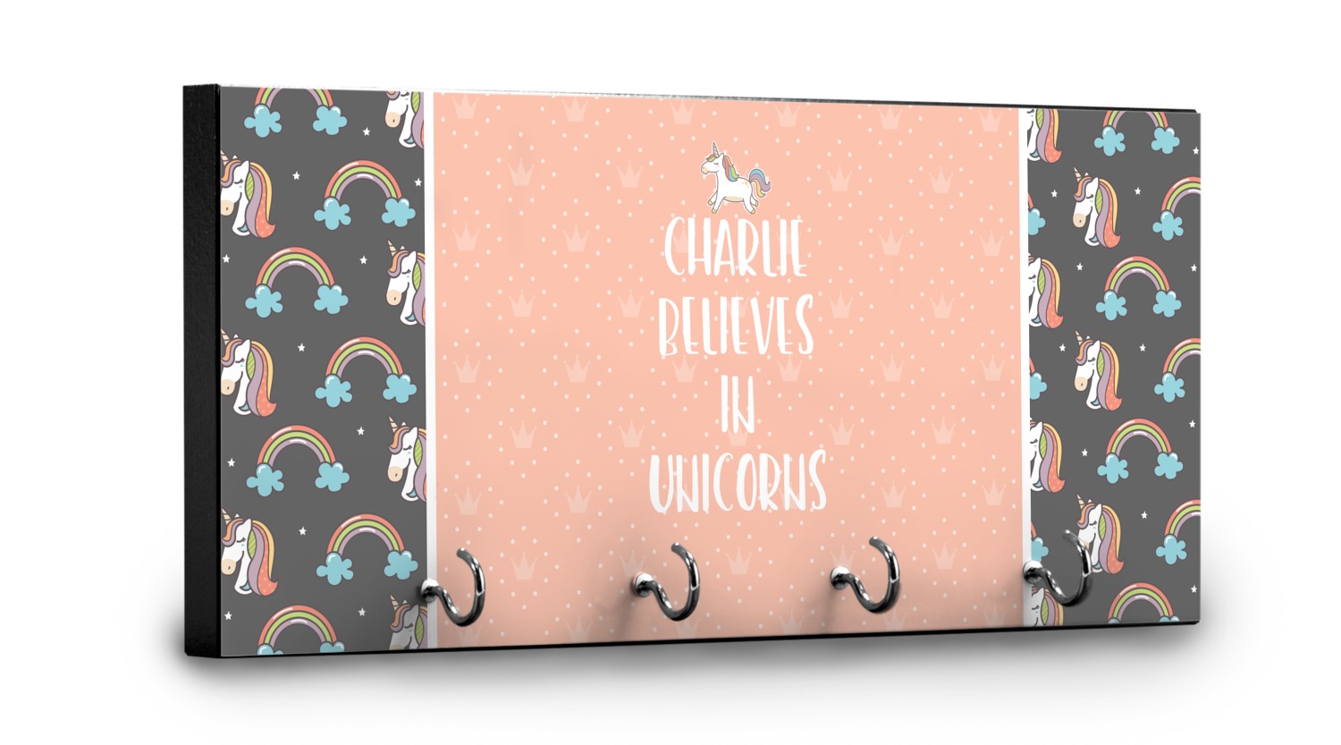 This fun unicorn design has a dark grey background with brightly colored unicorns and rainbows all across it.This pattern is on either side of a peach background with subtle crowns on it. Front and center is a fun saying that says "Charlie Believes In Unicorns" where "Charlie" can be replaced with your name. On the top of this text is a majestic leaping unicorn.