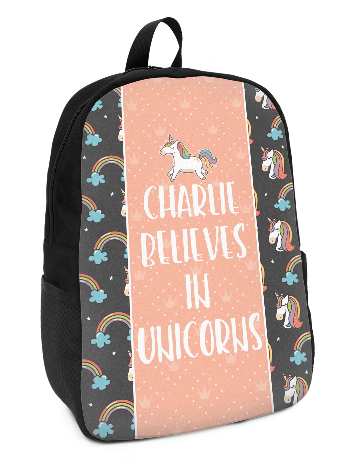 This fun unicorn design has a dark grey background with brightly colored unicorns and rainbows all across it.This pattern is on either side of a peach background with subtle crowns on it. Front and center is a fun saying that says "Charlie Believes In Unicorns" where "Charlie" can be replaced with your name. On the top of this text is a majestic leaping unicorn.