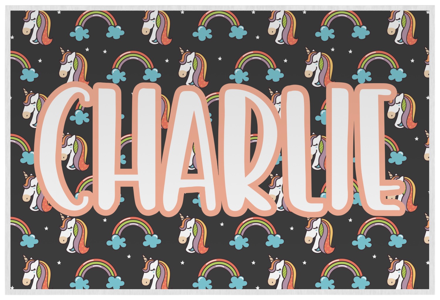 This fun unicorn design has a dark grey background with brightly colored unicorns and rainbows all across it.This pattern is on either side of a peach background with subtle crowns on it. Front and center is a fun saying that says "Charlie Believes In Unicorns" where "Charlie" can be replaced with your name. On the top of this text is a majestic leaping unicorn.