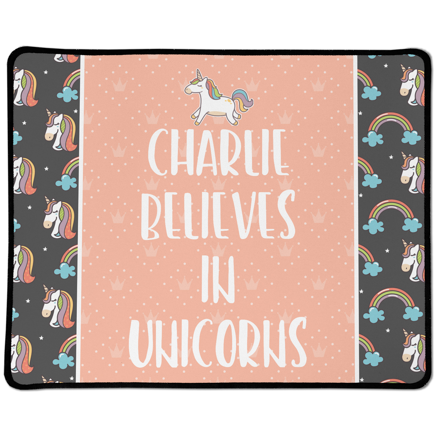 This fun unicorn design has a dark grey background with brightly colored unicorns and rainbows all across it.This pattern is on either side of a peach background with subtle crowns on it. Front and center is a fun saying that says "Charlie Believes In Unicorns" where "Charlie" can be replaced with your name. On the top of this text is a majestic leaping unicorn.