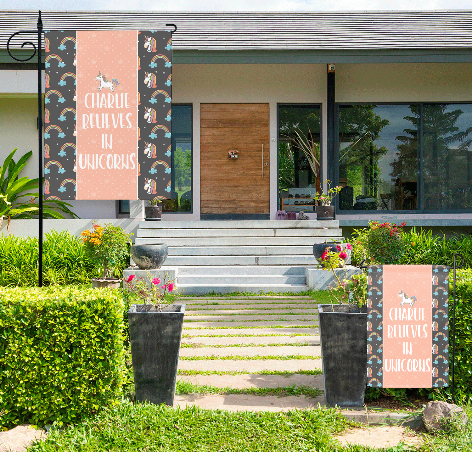 Decorate your front yard or your garden with one of our personalized garden flags! These garden flags will add a splash of color and personalization to any home's greenspace. Customize one with your name, favorite colors, and patterns, as a great addition to your home's exterior! Or, customize multiple seasonal flags and change them throughout the year!