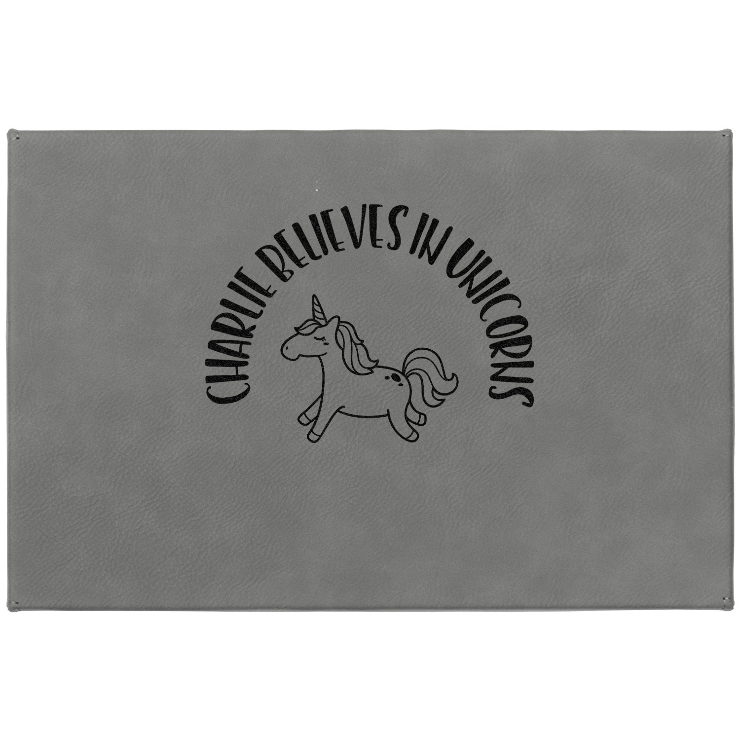 This fun unicorn design has a dark grey background with brightly colored unicorns and rainbows all across it.This pattern is on either side of a peach background with subtle crowns on it. Front and center is a fun saying that says "Charlie Believes In Unicorns" where "Charlie" can be replaced with your name. On the top of this text is a majestic leaping unicorn.