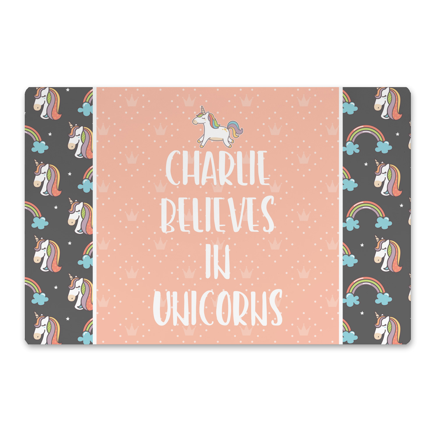 This fun unicorn design has a dark grey background with brightly colored unicorns and rainbows all across it.This pattern is on either side of a peach background with subtle crowns on it. Front and center is a fun saying that says "Charlie Believes In Unicorns" where "Charlie" can be replaced with your name. On the top of this text is a majestic leaping unicorn.