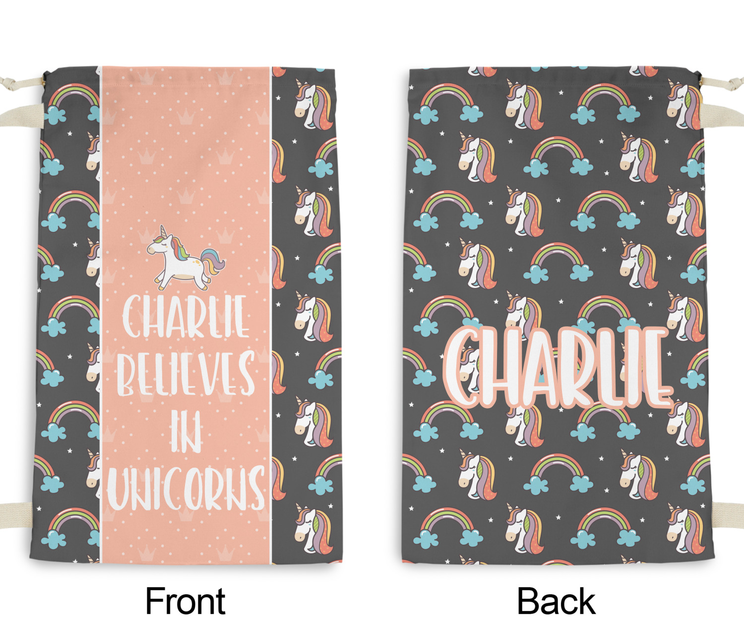 This fun unicorn design has a dark grey background with brightly colored unicorns and rainbows all across it.This pattern is on either side of a peach background with subtle crowns on it. Front and center is a fun saying that says "Charlie Believes In Unicorns" where "Charlie" can be replaced with your name. On the top of this text is a majestic leaping unicorn.