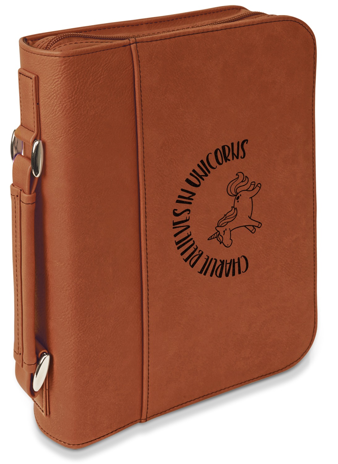These book covers are fabricated from a fine leatherette in a warm, cognac shade of brown. A wide pocket spans across the front of the book jacket [2,400] and can store any loose papers or notes that you wish to keep. The interior of this personalized Bible cover includes slots on both sides to house the covers of your Bible, and keep it in place. The inside of the spine has a small elastic band to secure a pen. A zipper lines three sides of the cover, while the fourth side features a reinforced handle that allows for easy transport of your enclosed book.