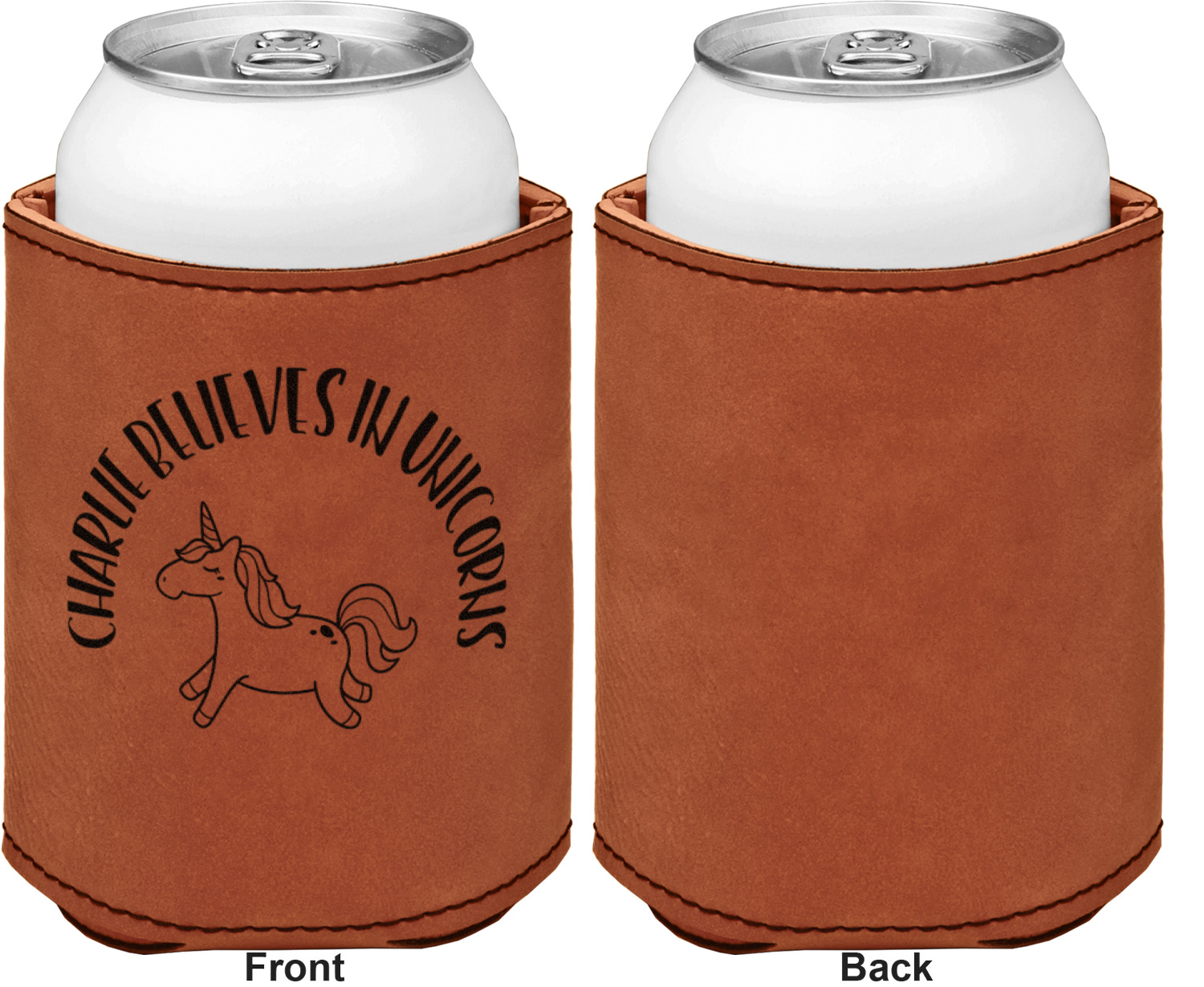 This can sleeve is made from a cognac-brown leatherette and stitched with a sturdy, black thread. A slim padding lines the inside of your can sleeve to allow for a better fit once your drink is inserted. The sleeve itself measures at 4 by 4.5 inches, allowing this custom can sleeve to accommodate most canned drinks. Your personalized design can be engraved on the front and back, or solely the front. When laser-engraved, your design appears as a black coloration which contrasts the leatherette nicely.