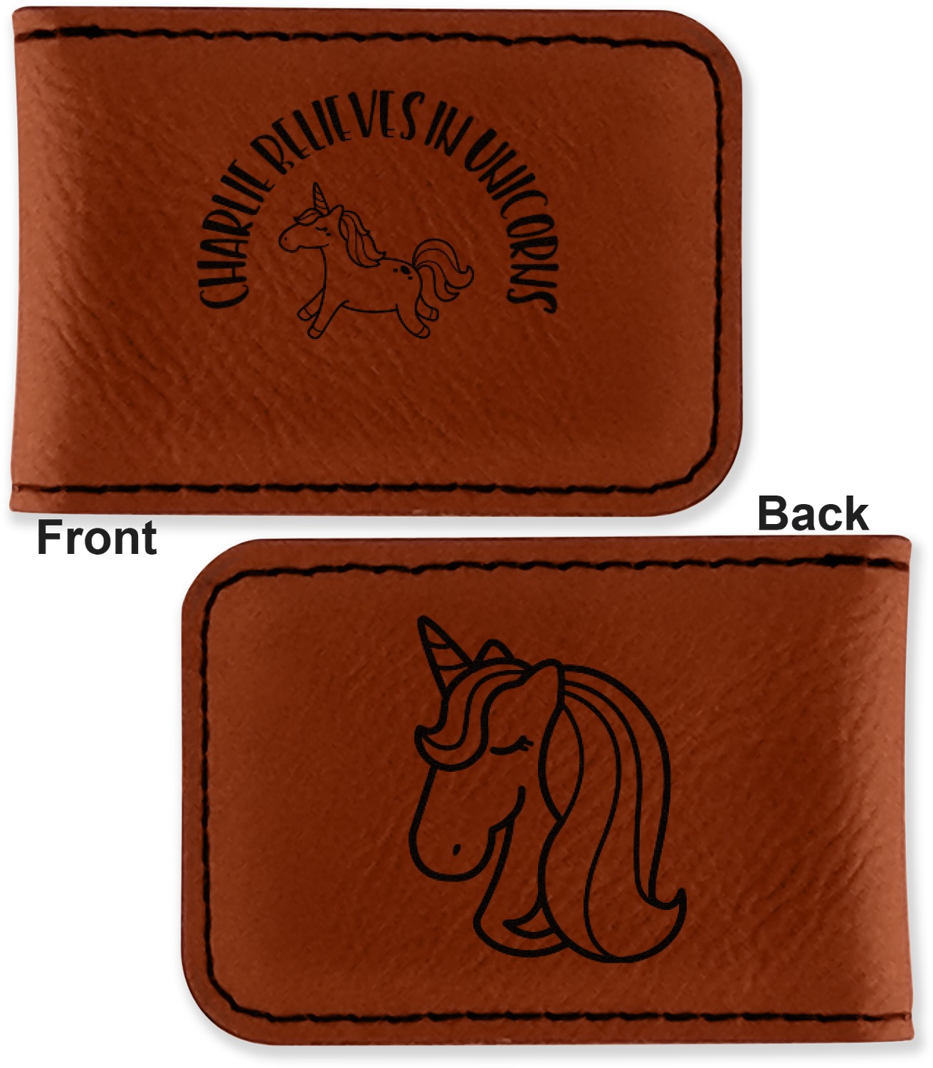 Your money clip will be laser engraved so that the design you choose will come out black. Find a fun graphic, monogram, or font to use to personalize your money clip either on just the front or the front and the back.