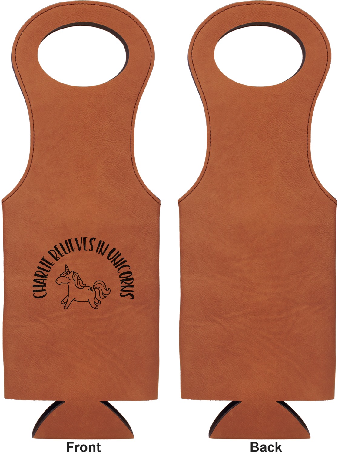 This wine carrier is made from a stunning leatherette, in a cognac-brown color. Strong, black stitching lines the sides of your wine bottle bag and provides extra durability. The interior is lined with a padded, black material to allow for a snug fit once your bottle is placed inside. At the top of this wine gift bag, you'll find two oval shaped handles that elegantly complements the rest of the bag's style. We provide you with the option of laser-engraving the front, or the front and back of your new personalized wine bag!