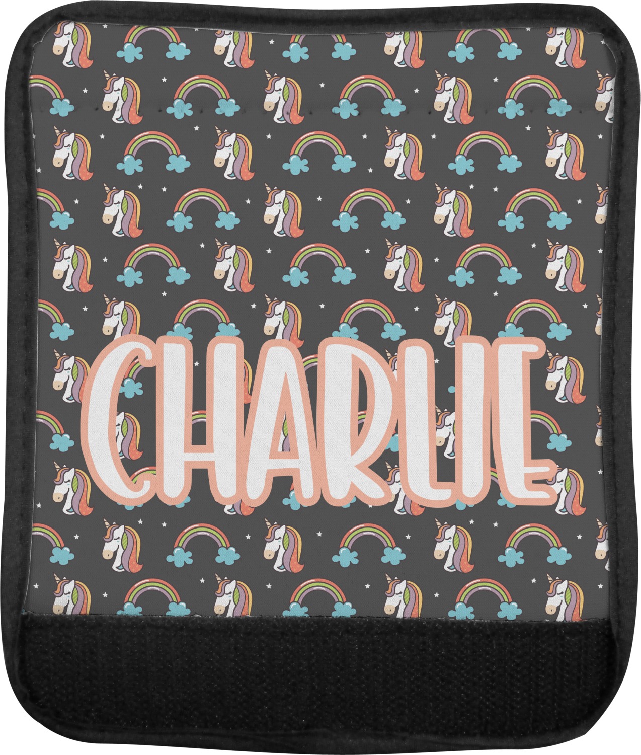 This fun unicorn design has a dark grey background with brightly colored unicorns and rainbows all across it.This pattern is on either side of a peach background with subtle crowns on it. Front and center is a fun saying that says "Charlie Believes In Unicorns" where "Charlie" can be replaced with your name. On the top of this text is a majestic leaping unicorn.
