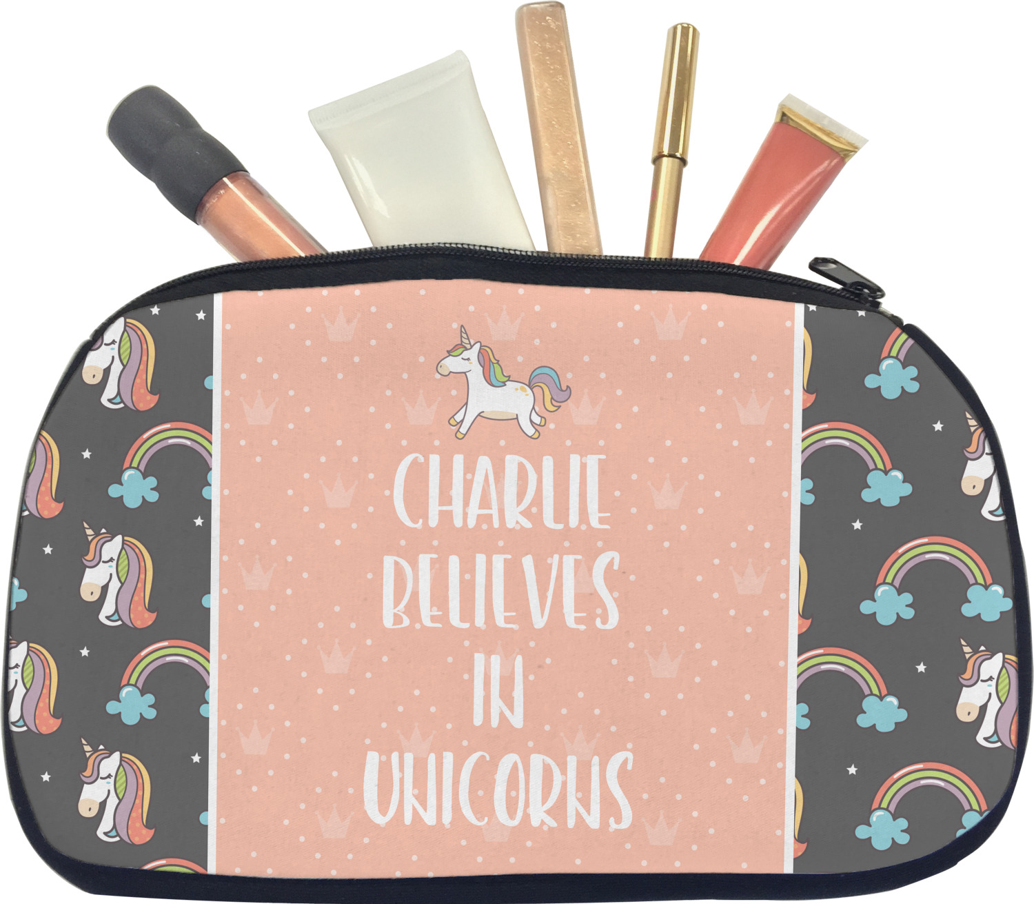 This fun unicorn design has a dark grey background with brightly colored unicorns and rainbows all across it.This pattern is on either side of a peach background with subtle crowns on it. Front and center is a fun saying that says "Charlie Believes In Unicorns" where "Charlie" can be replaced with your name. On the top of this text is a majestic leaping unicorn.