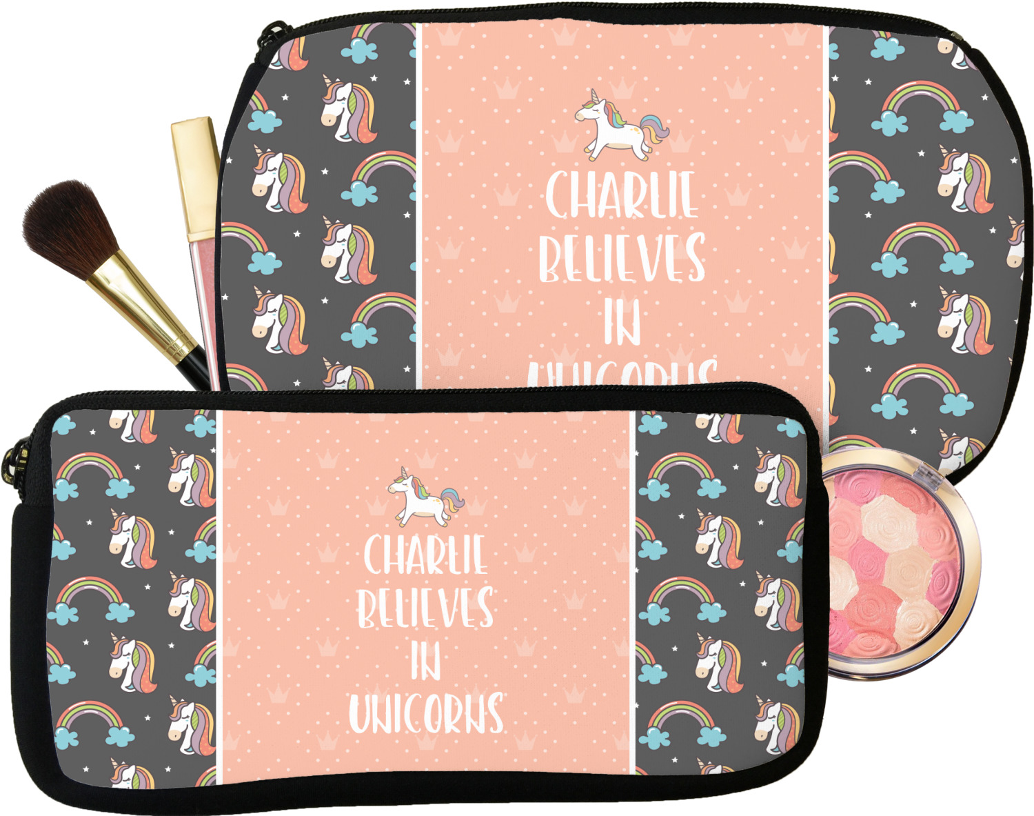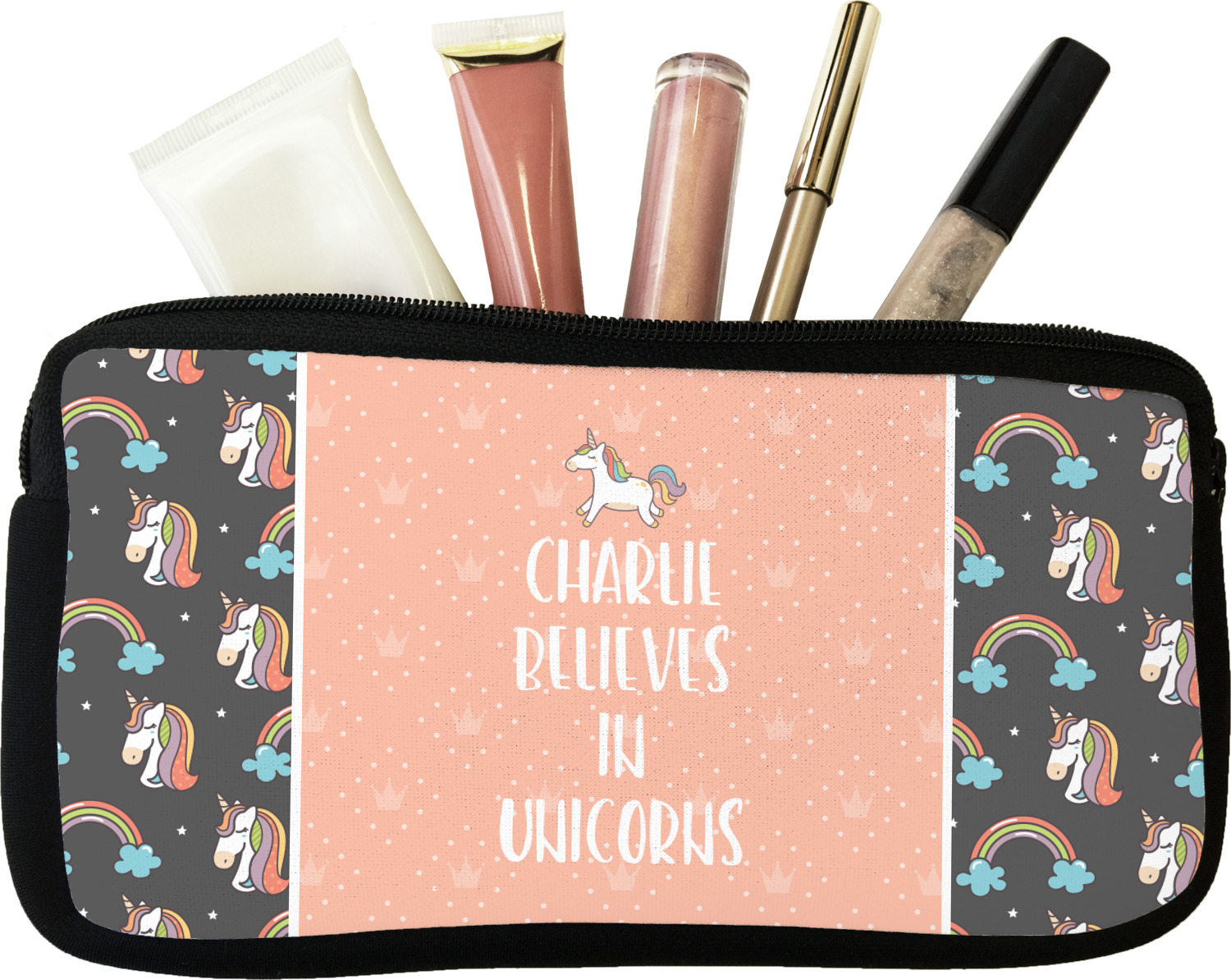 Our personalized makeup bags are available in many different designs, patterns and colors - so you are sure to find one that will love. They are made of neoprene (same material as wet-suits) and thus are water resistant, so spillages in your makeup bag will not end up all over you purse. They are customized on one side and are black on the other side and the zipper is black as well.