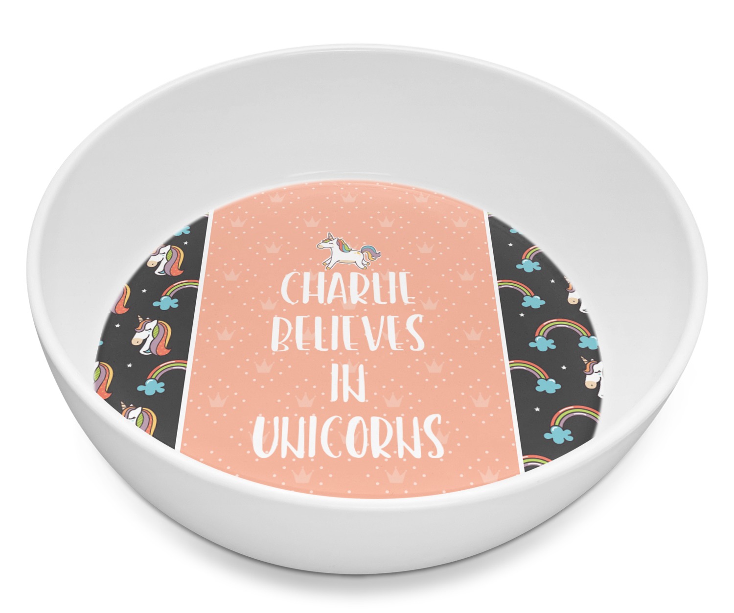This fun unicorn design has a dark grey background with brightly colored unicorns and rainbows all across it.This pattern is on either side of a peach background with subtle crowns on it. Front and center is a fun saying that says "Charlie Believes In Unicorns" where "Charlie" can be replaced with your name. On the top of this text is a majestic leaping unicorn.