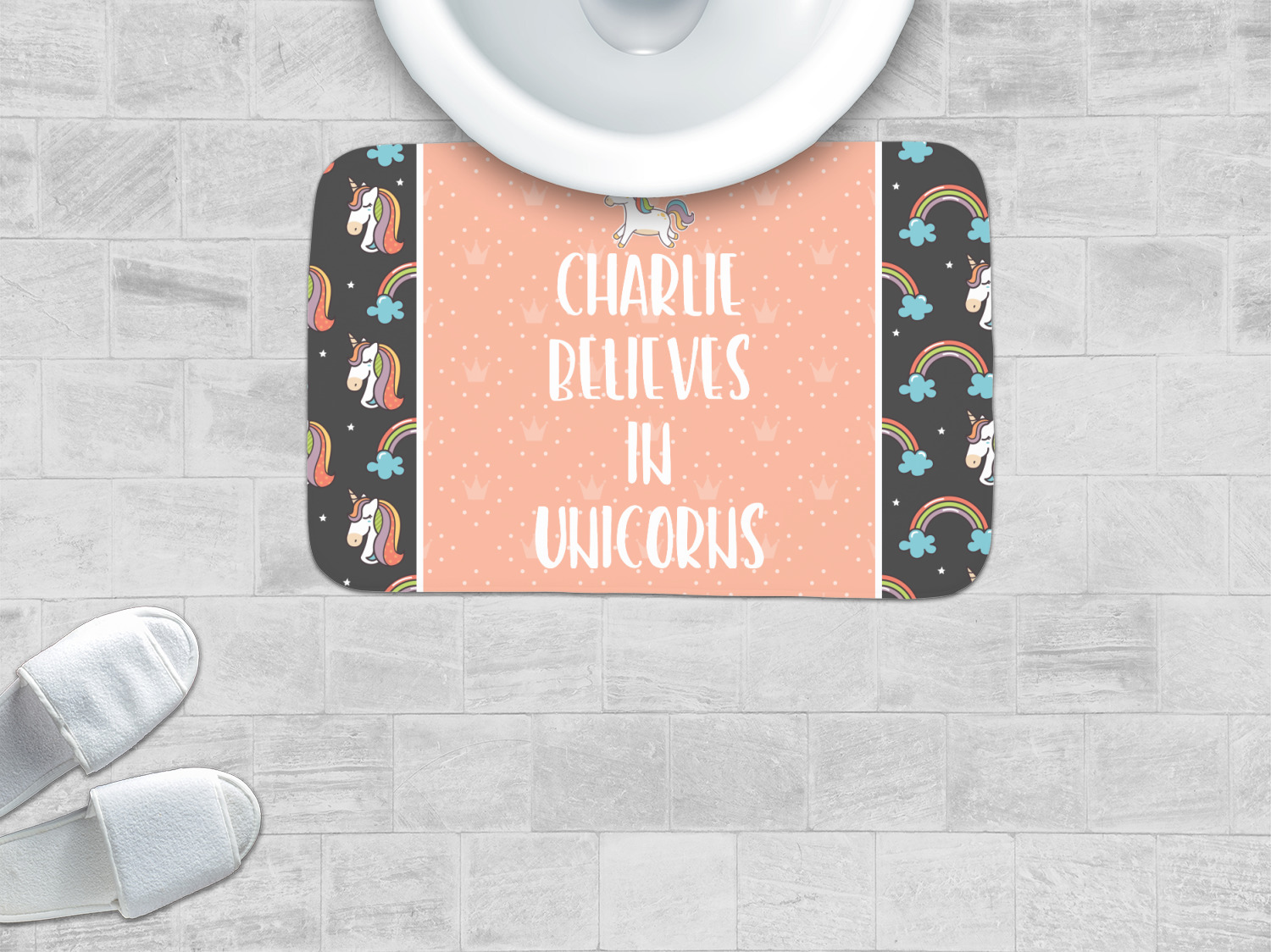 This fun unicorn design has a dark grey background with brightly colored unicorns and rainbows all across it.This pattern is on either side of a peach background with subtle crowns on it. Front and center is a fun saying that says "Charlie Believes In Unicorns" where "Charlie" can be replaced with your name. On the top of this text is a majestic leaping unicorn.
