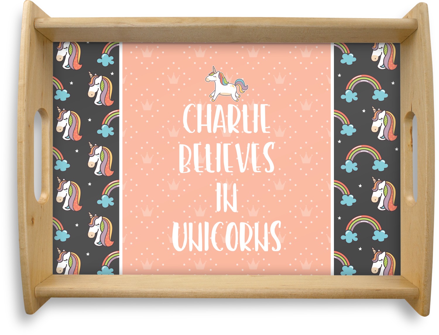 This fun unicorn design has a dark grey background with brightly colored unicorns and rainbows all across it.This pattern is on either side of a peach background with subtle crowns on it. Front and center is a fun saying that says "Charlie Believes In Unicorns" where "Charlie" can be replaced with your name. On the top of this text is a majestic leaping unicorn.