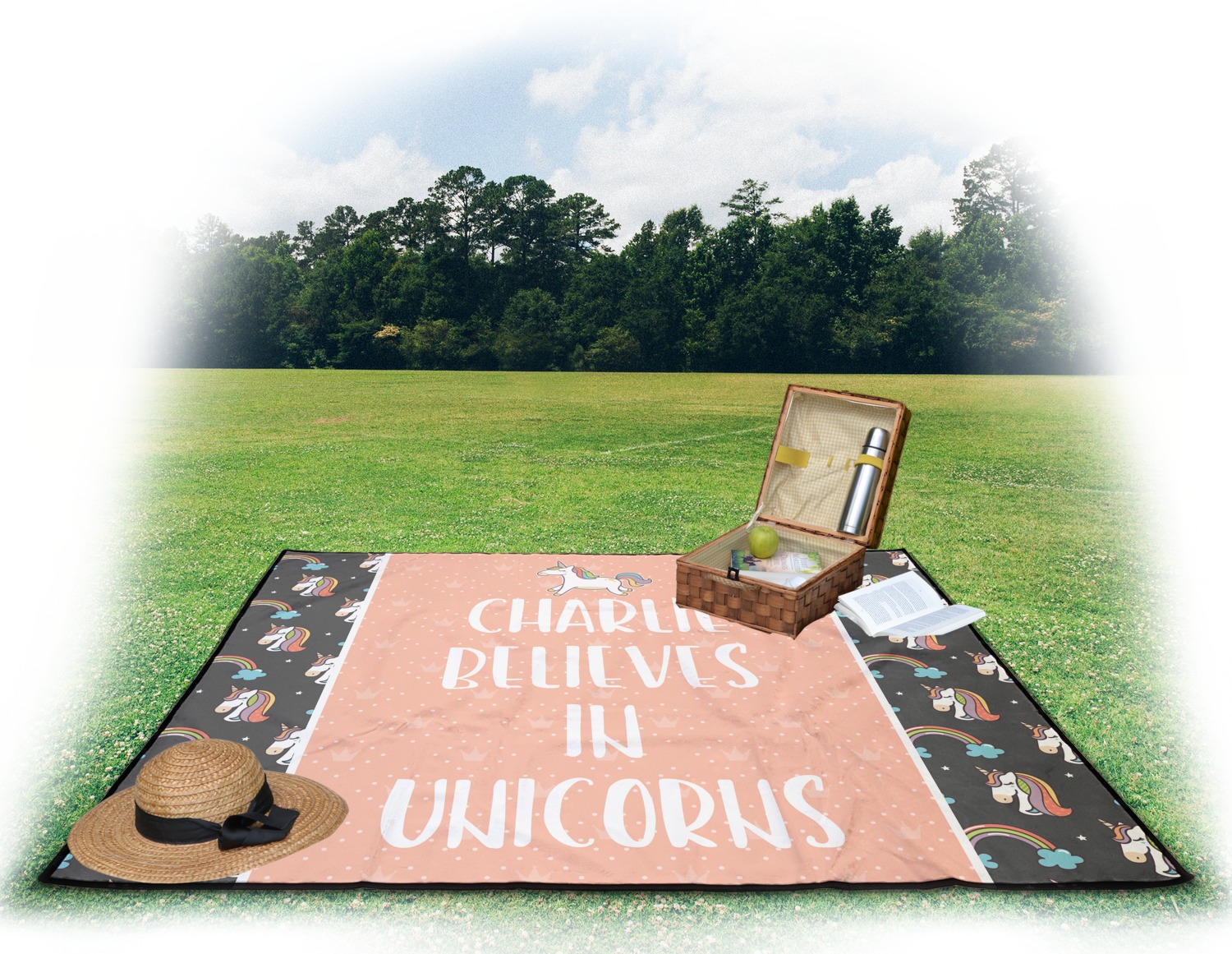 This picnic blanket is perfect for hanging out with your friends at the park or anywhere outside. The top of the blanket is made of a super soft microfiber fleece. The bottom of the blanket is made of a black material similar to a rain jacket and is water repellent as well. This will keep any wet spots on the ground from soaking through your picnic blanket. No one likes a wet blanket. The blanket measures at approximately 50" x 59" and has a nicely finished ribbon edge.