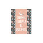 This fun unicorn design has a dark grey background with brightly colored unicorns and rainbows all across it.This pattern is on either side of a peach background with subtle crowns on it. Front and center is a fun saying that says "Charlie Believes In Unicorns" where "Charlie" can be replaced with your name. On the top of this text is a majestic leaping unicorn.