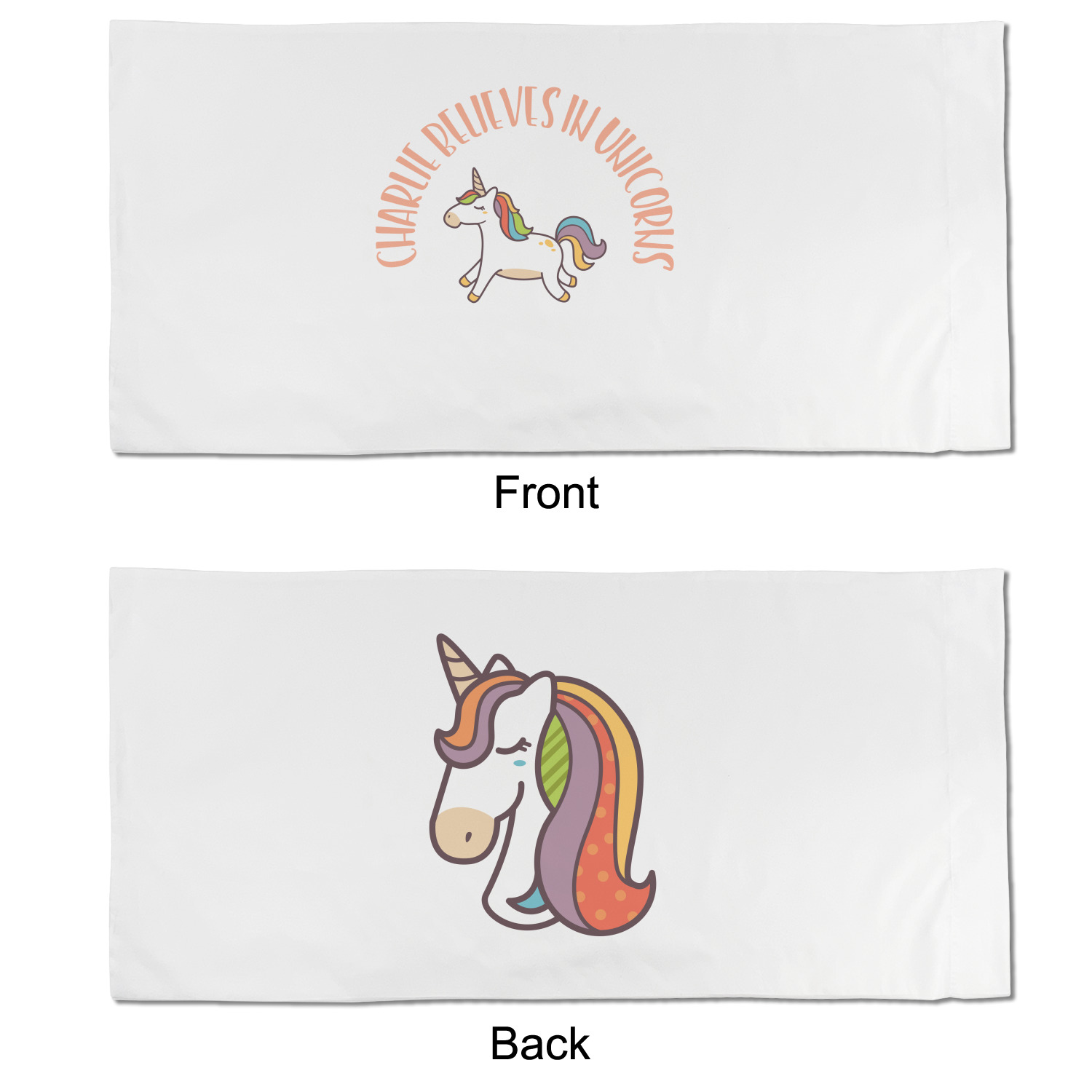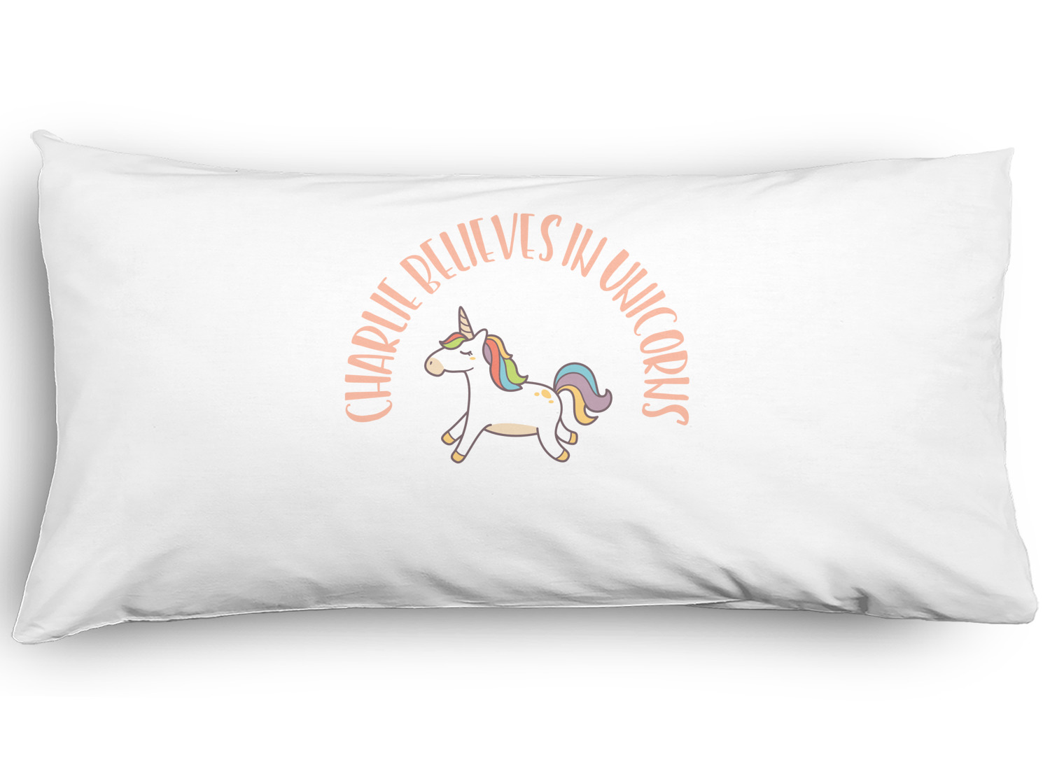 This fun unicorn design has a dark grey background with brightly colored unicorns and rainbows all across it.This pattern is on either side of a peach background with subtle crowns on it. Front and center is a fun saying that says "Charlie Believes In Unicorns" where "Charlie" can be replaced with your name. On the top of this text is a majestic leaping unicorn.
