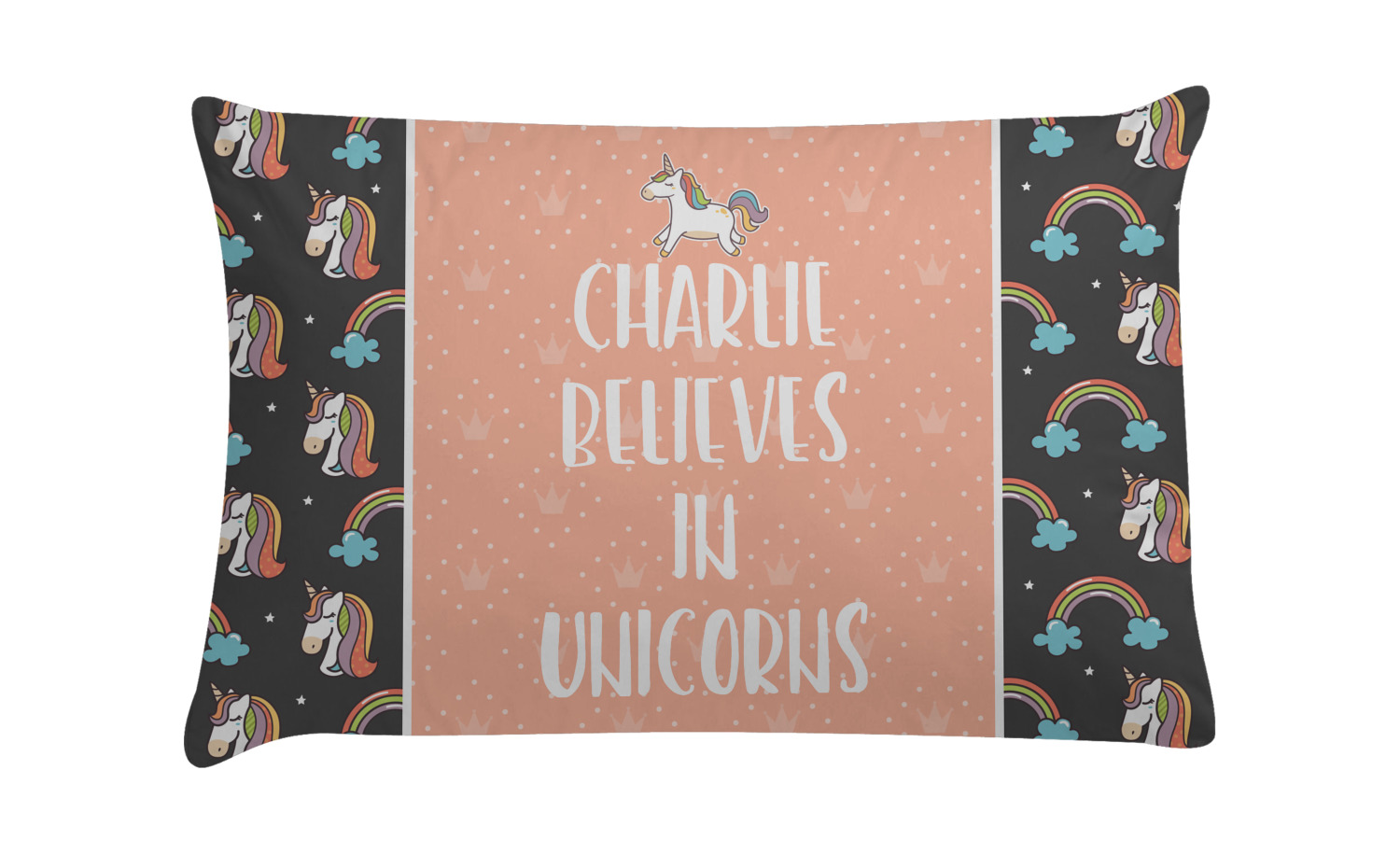 This fun unicorn design has a dark grey background with brightly colored unicorns and rainbows all across it.This pattern is on either side of a peach background with subtle crowns on it. Front and center is a fun saying that says "Charlie Believes In Unicorns" where "Charlie" can be replaced with your name. On the top of this text is a majestic leaping unicorn.