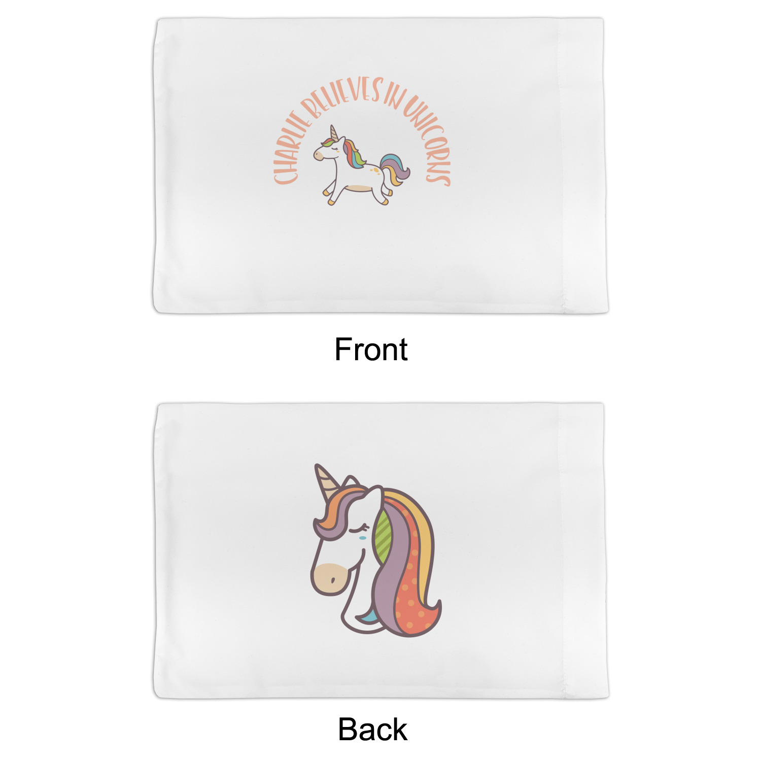 This fun unicorn design has a dark grey background with brightly colored unicorns and rainbows all across it.This pattern is on either side of a peach background with subtle crowns on it. Front and center is a fun saying that says "Charlie Believes In Unicorns" where "Charlie" can be replaced with your name. On the top of this text is a majestic leaping unicorn.