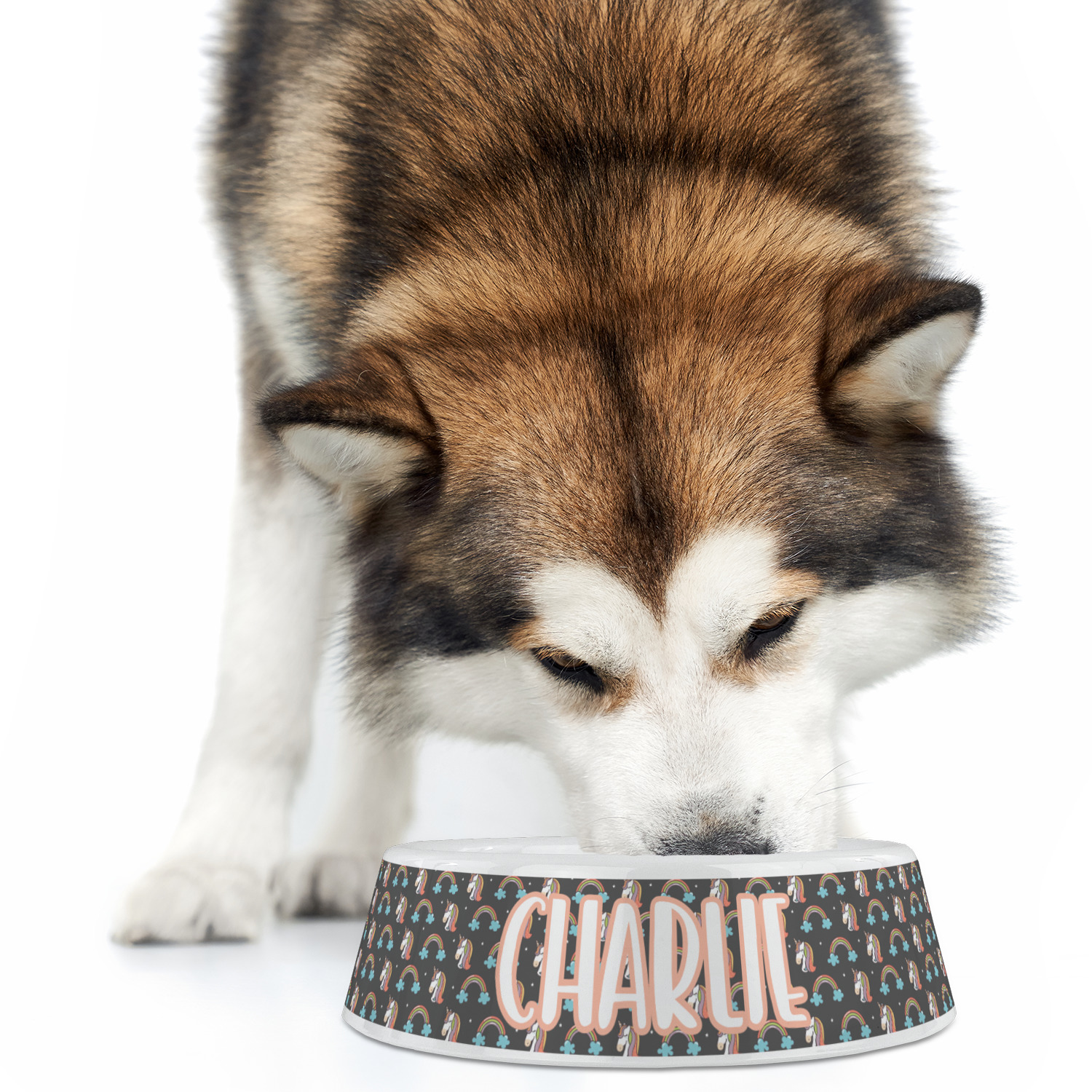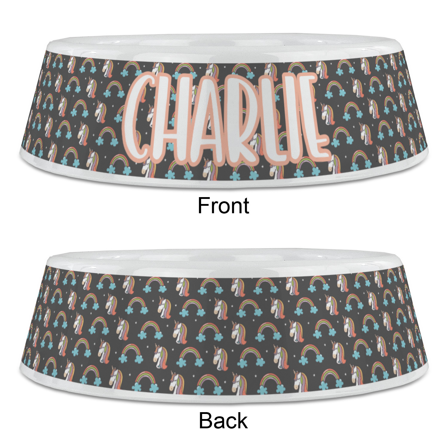 This fun unicorn design has a dark grey background with brightly colored unicorns and rainbows all across it.This pattern is on either side of a peach background with subtle crowns on it. Front and center is a fun saying that says "Charlie Believes In Unicorns" where "Charlie" can be replaced with your name. On the top of this text is a majestic leaping unicorn.