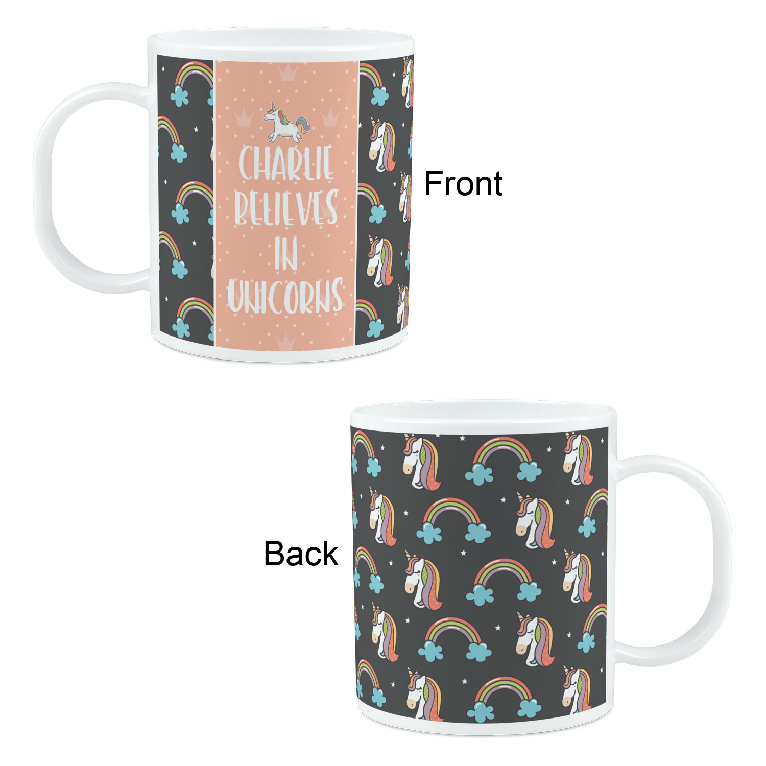 This fun unicorn design has a dark grey background with brightly colored unicorns and rainbows all across it.This pattern is on either side of a peach background with subtle crowns on it. Front and center is a fun saying that says "Charlie Believes In Unicorns" where "Charlie" can be replaced with your name. On the top of this text is a majestic leaping unicorn.