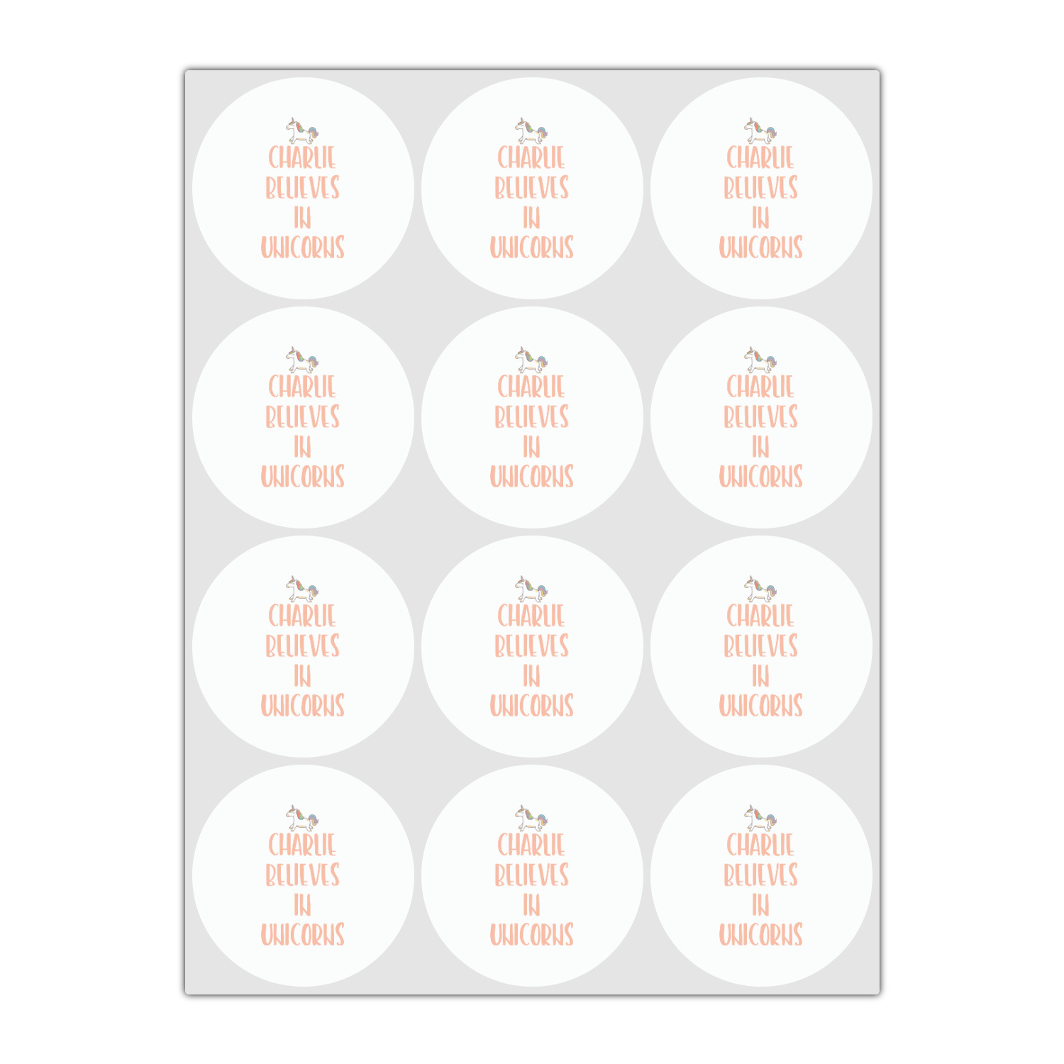 This fun unicorn design has a dark grey background with brightly colored unicorns and rainbows all across it.This pattern is on either side of a peach background with subtle crowns on it. Front and center is a fun saying that says "Charlie Believes In Unicorns" where "Charlie" can be replaced with your name. On the top of this text is a majestic leaping unicorn.