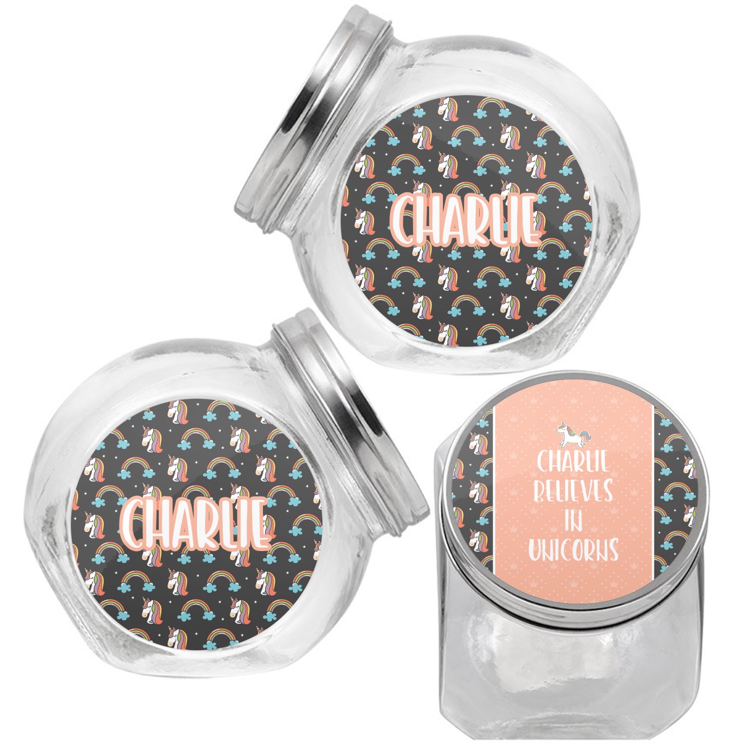 This treat jar is an excellent way to store treats for your favorite canine or feline. Moreover, their delicate, classy appearance makes them a tasteful addition to your countertop's décor. Crafted from clear glass, its unique construction and silver metal, screw-on lid allows for quick and easy access. Three, permanent, vinyl stickers are applied to both sides of the jar and lid, presenting your personalized design. The base of this glass, dog treat jar is 3.4" x 4.75", and the jar stands at 5" tall. Though on the smaller side, this jar is best suited for smaller treats or training treats.
