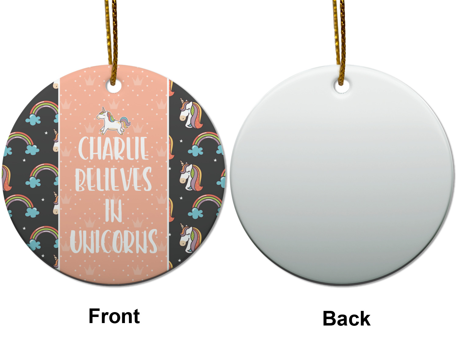 This fun unicorn design has a dark grey background with brightly colored unicorns and rainbows all across it.This pattern is on either side of a peach background with subtle crowns on it. Front and center is a fun saying that says "Charlie Believes In Unicorns" where "Charlie" can be replaced with your name. On the top of this text is a majestic leaping unicorn.